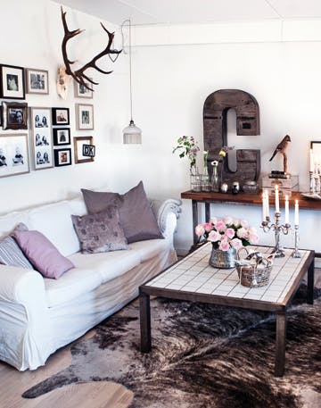 Når man er en rigtig samler med hang til at forelske sig i alverdens ting, kan det være svært at holde orden på det hele. Men Carina har fundet en fin løsning på problemet i form af forskellige kurve til at samle tingene i. Kurvene, der både er i forskellige størrelser og materialer, står rundtomkring i huset og er fyldt med alt fra puder og plaider til blade og strikketøj. Selvom Carina har indrettet huset i sin egen feminine stil, lægger hun vægt på, at der skal være nogle rustikke kontraster. Det får hun bl.a. med rensdyrskind, gevirer og materialer som stål og metal sammen med de offwhite sofaer med bløde pastelfarvede puder og vatterede tæpper. Specielt konsolbordet og de to kakkelborde med stålstel er hun rigtig glad for, fordi de står så flot sammen med de smukke gamle ting og møbler. De rustikke stålrammer har hun selv tegnet og har så fået en smed til at lave dem for hende. Derefter har hun og hendes far i fællesskab lagt kaklerne i bordpladen. Det store dekorative C, som står og troner på stuens rustikke konsolbord, er også en af de ting, som Carina holder meget af.