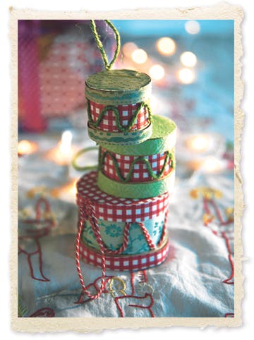 Fortsæt på denne måde med at lime snoren på i skrå takker hele vejen rundt. Inden du klipper snoren af, folder du den dobbelt og laver en løkke, som trommen kan hænge i.