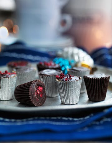 Læg nu et tyndt lag chokolade på toppen som låg, og drys med tørrede hindbær. Du kan også drysse nogle af chokoladetoppene med forskellige finthakkede nødder eller spiseligt guldglimmer, hvis du vil have lidt variation.