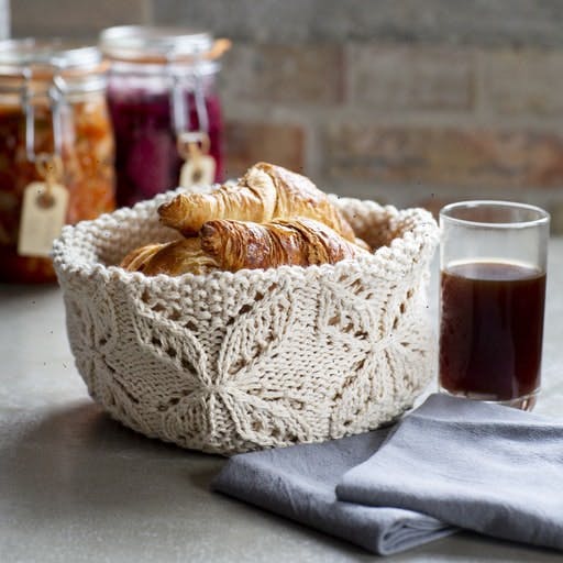Server dit brød i denne strikkede brødkurv. Brødkurven strikkes med tredobbelt garn, som gør, at den holder formen. Få strikkeopskriften her.