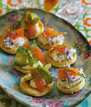 Af Mette Jantzen. Foto: Jes Buusmann Blinis (ca. 16 stk)100 g hvedemel1 tsk bagepulver1 tsk salt2 æg½ dl mælkCa. 25 g smør til stegning