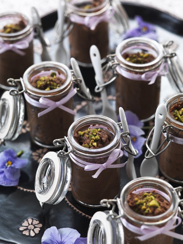 Pisk fløden til skum, og vend 1/3 af det over i chokoladeblandingen. Denne blanding vendes forsigtigt tilbage i resten af flødeskummet. Fordel trøffelcremen i de små glas, og stil dem på køl, til de skal serveres. Pynt med pistacienødder, og server.