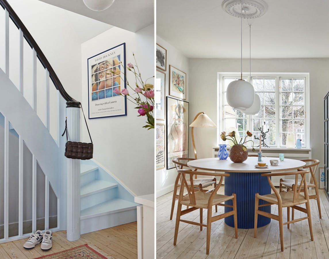 Når hun træder ind ad hoveddøren i murermestervillaen efter en arbejdsdag, er det første, der møder hende den lyseblå trappe, som får modspil af små lyserøde og orange glimt. De små farveeksplosioner op imod store, neutrale flader er for Ann-Sophie med til at skabe ro for øjet.