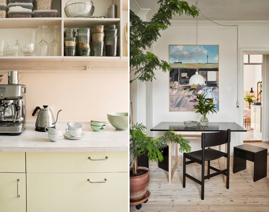 Skamlerne kan stå hver for sig eller samles til en bænk, der giver plads til flere mennesker om bordet. Frederikke har selv bygget begge dele og lavet maleriet på væggen. Stolen er fra Takt, mens lampe, skål og vase alle er loppefund.