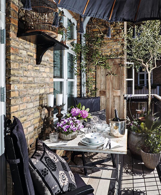 Den 10 m² store altan er lavet af sortlakeret jern med træbeklædt gulv, der er behandlet med pibeler, så det er lyst. Et vindue og en dobbeltdør fører fra stuen ud på altanen, hvor der mellem frodigheden og under parasollen også lige er blevet plads til et lille bord til familien på tre – eller fire, hvis vi tæller Caspian med. En skøn, fræk, grå uldtot af en europæisk korthårskat.