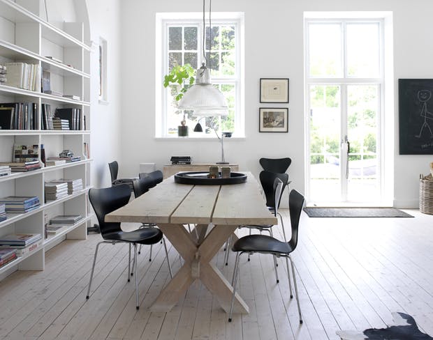 Garderobestativet er spritnyt, jakkerne, der hænger på det, er ubrugte, ligesom den sorte 7’er-stol også er det. Entréen i det tidligere missionshus ligner mere en butik end et hjem. Og det er slet ikke tilfældigt. For i missionshuset har Boutique Pim taget over, hvor de højere magter slap. Det 450 kvadratmeter store hus ligger på en stille villavej tæt ved bymidten i Ängelholm i Skåne. Her bor Pia Björkenfeldt, der i 28 år har haft livsstilsbutikken Boutique Pim. Alene det lille kors på gavlen og to små blyindfattede vinduer signalerer, at det ikke er et almindeligt parcelhus. Indendørs er huset, der er bygget i 1930, et gennemført og noget overraskende showroom for Pia Björkenfeldts kunder.
