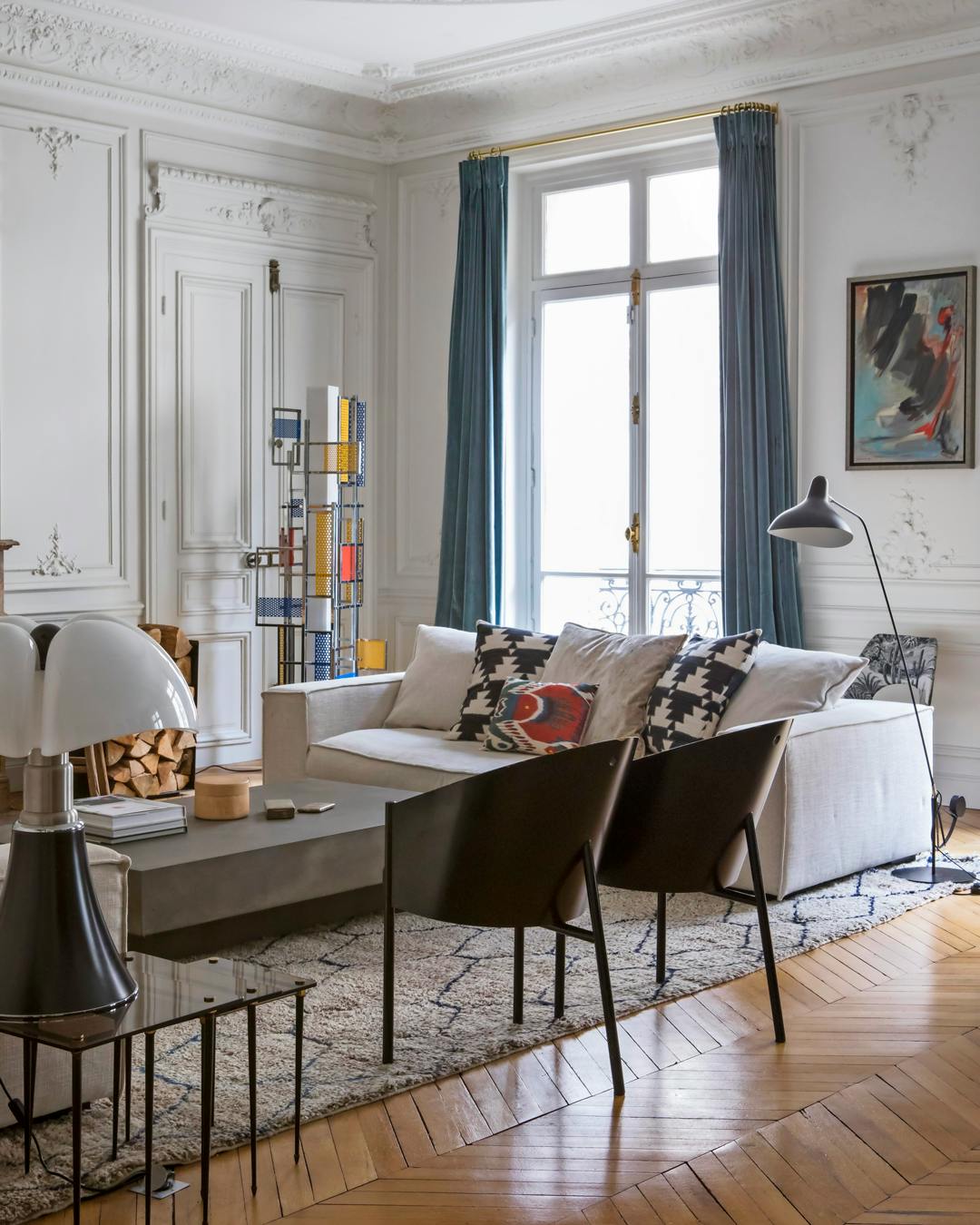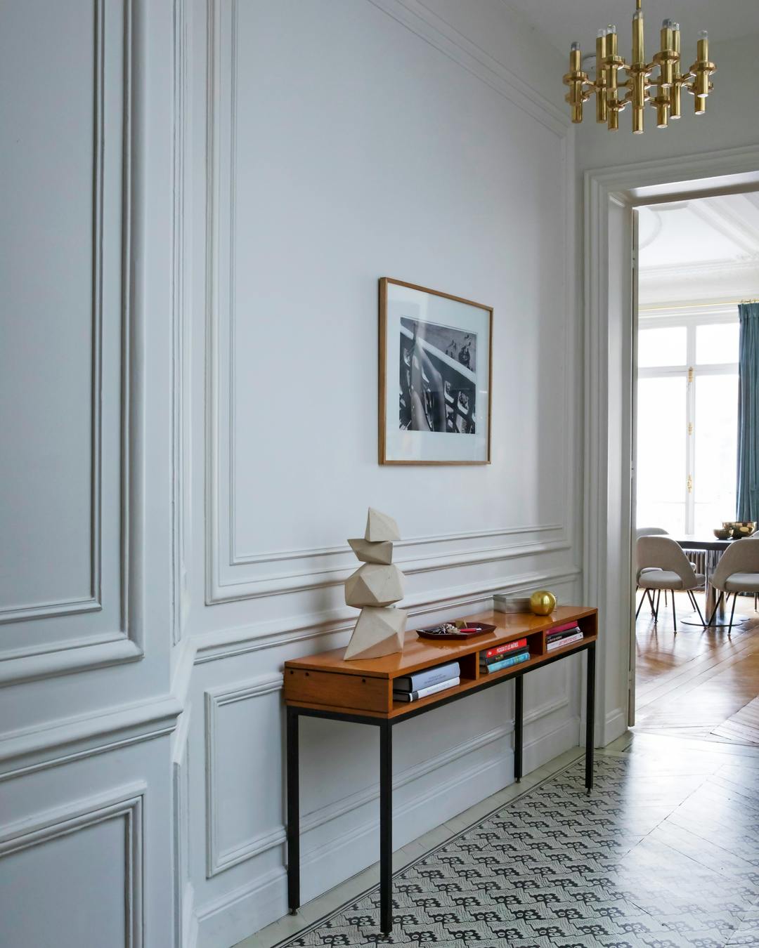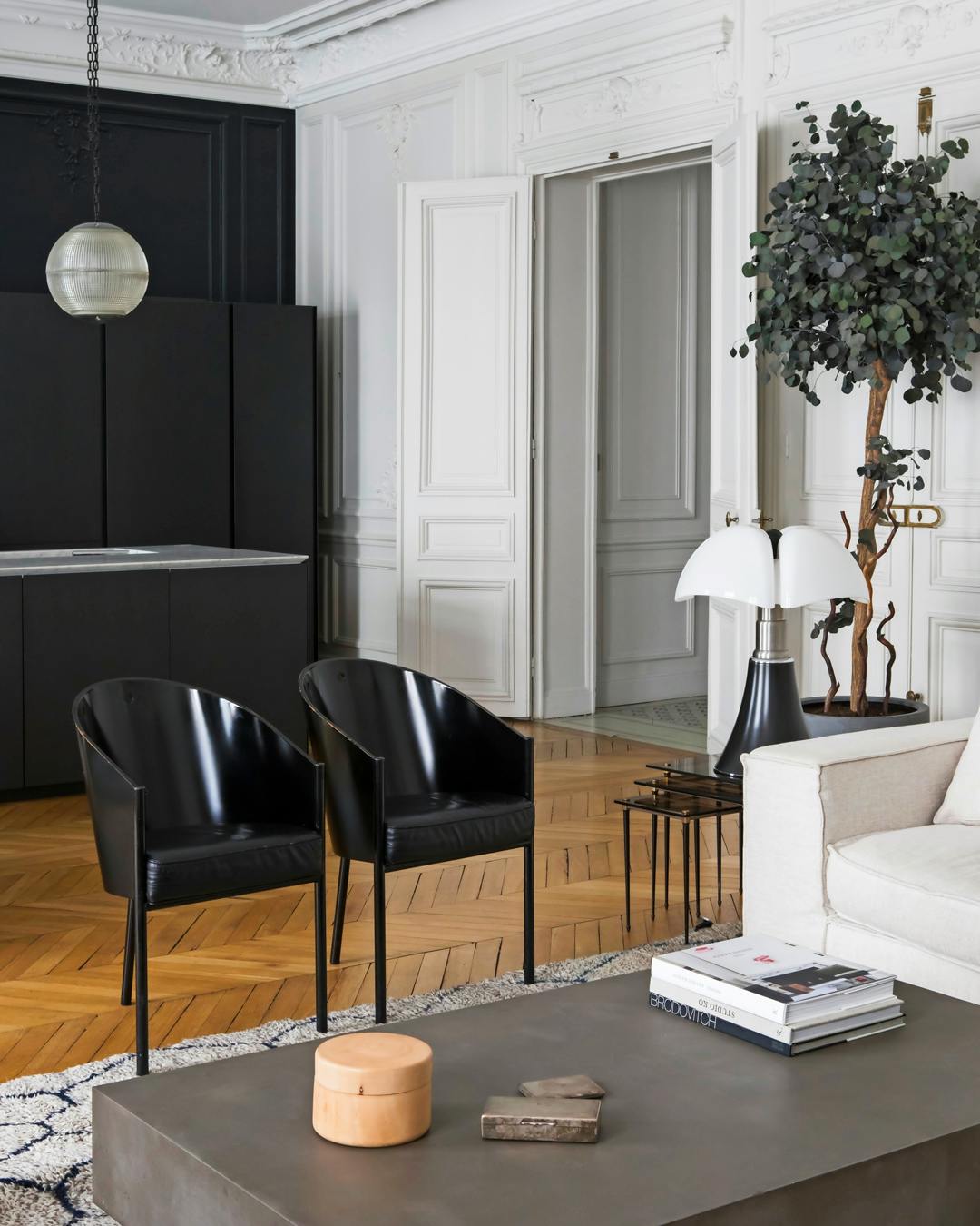 Det skulle ikke være for klassisk, fortæller Barbara Bachmann, der til daglig arbejder som interiørdesigner, om tanken bag indretningen i hendes og familiens hjem i Paris. Rammerne om indretningen er ellers lige præcis klassiske, for lejligheden fra 1800-tallet er fyldt med elementer som paneler på væggene, sildebensparket på gulvet og stuk i loftet. Derfor har neutral og diskret været nøgleordene for Barbara Bachmanns øvrige indretning af den herskabelige bolig, der bortset fra et par enkelte blå elementer hovedsageligt er holdt i farverne hvid, grå og sort. – Mine kunder beder altid om så meget udsmykning, men jeg bliver træt af tapeter, farver osv. Det er ikke det, jeg lægger i begrebet indretning. Jeg har lige akkurat dristet mig til at male stuens vægge sorte, og det er et stort skridt for mig, griner Barbara Bachmann.