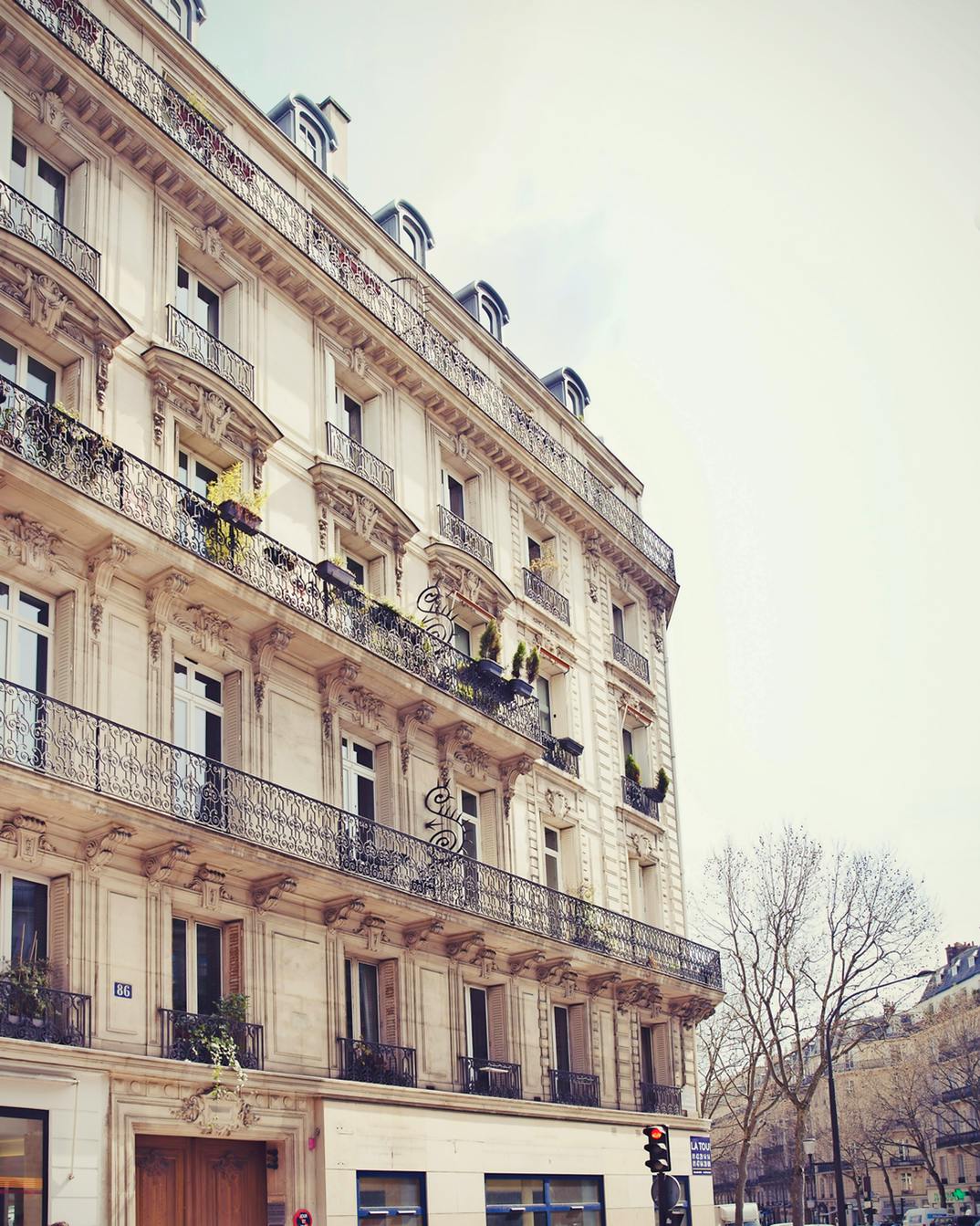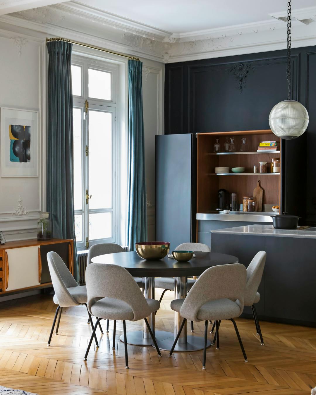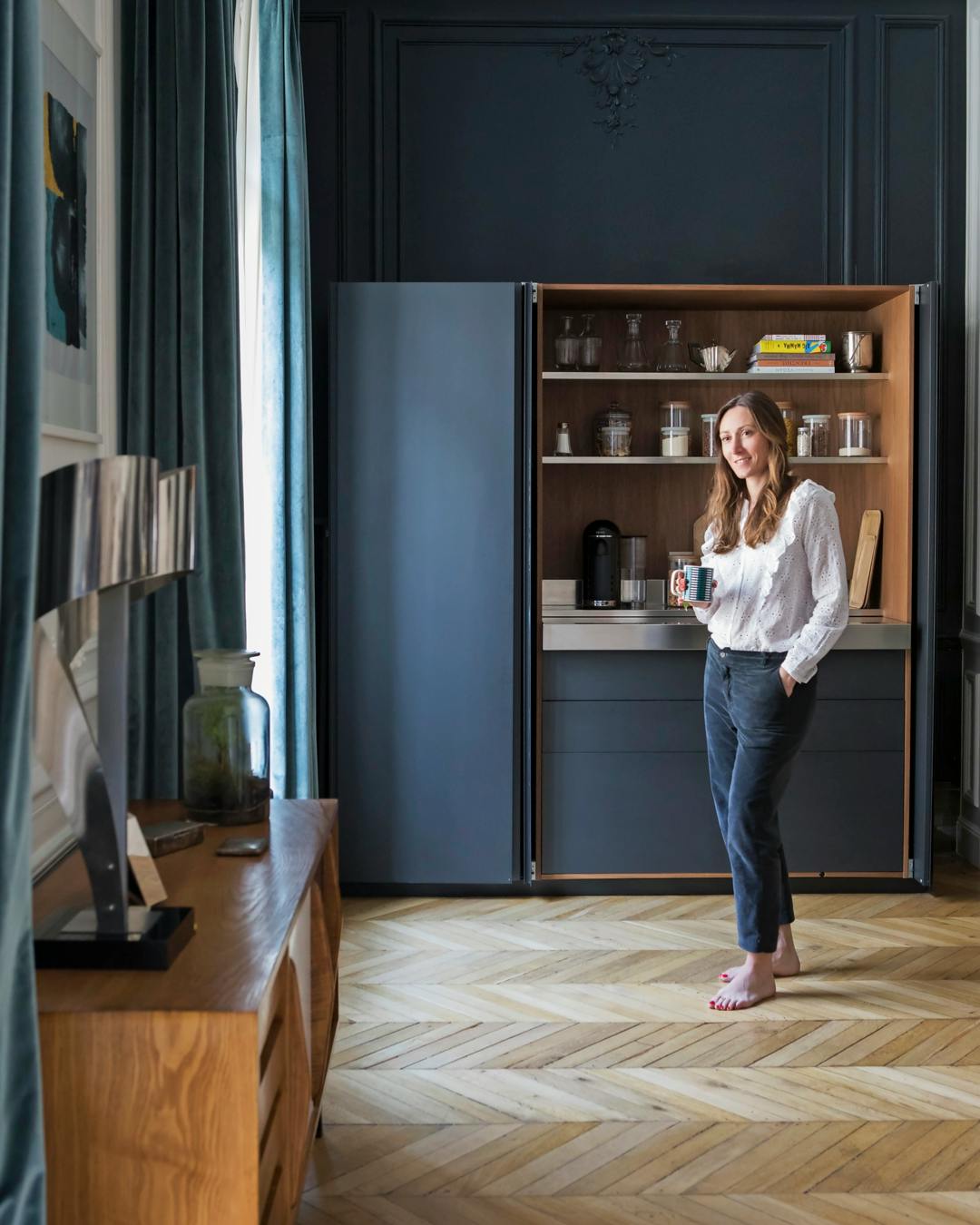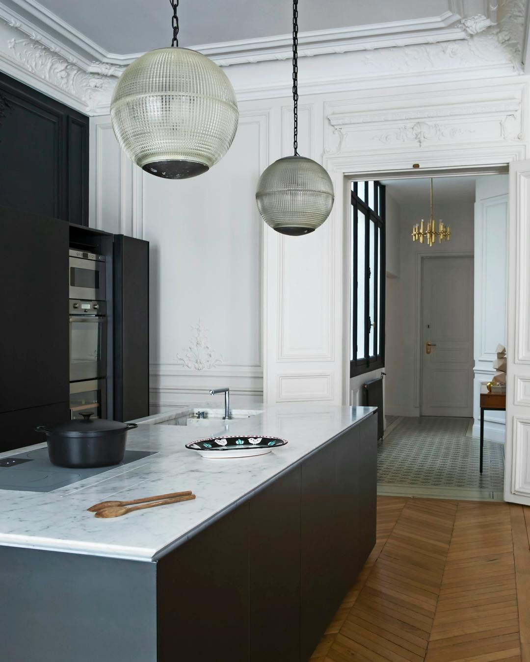 Georges Eugène Haussmann (1809-1891) var en fransk byplanlægger, der har givet Paris' klassiske charme – og som har lagt navn til stilarten Haussmannian. Herskabslejligheden her ligger i en sådan bygning. Pendlen over køkkenøen er fundet på et loppemarked.