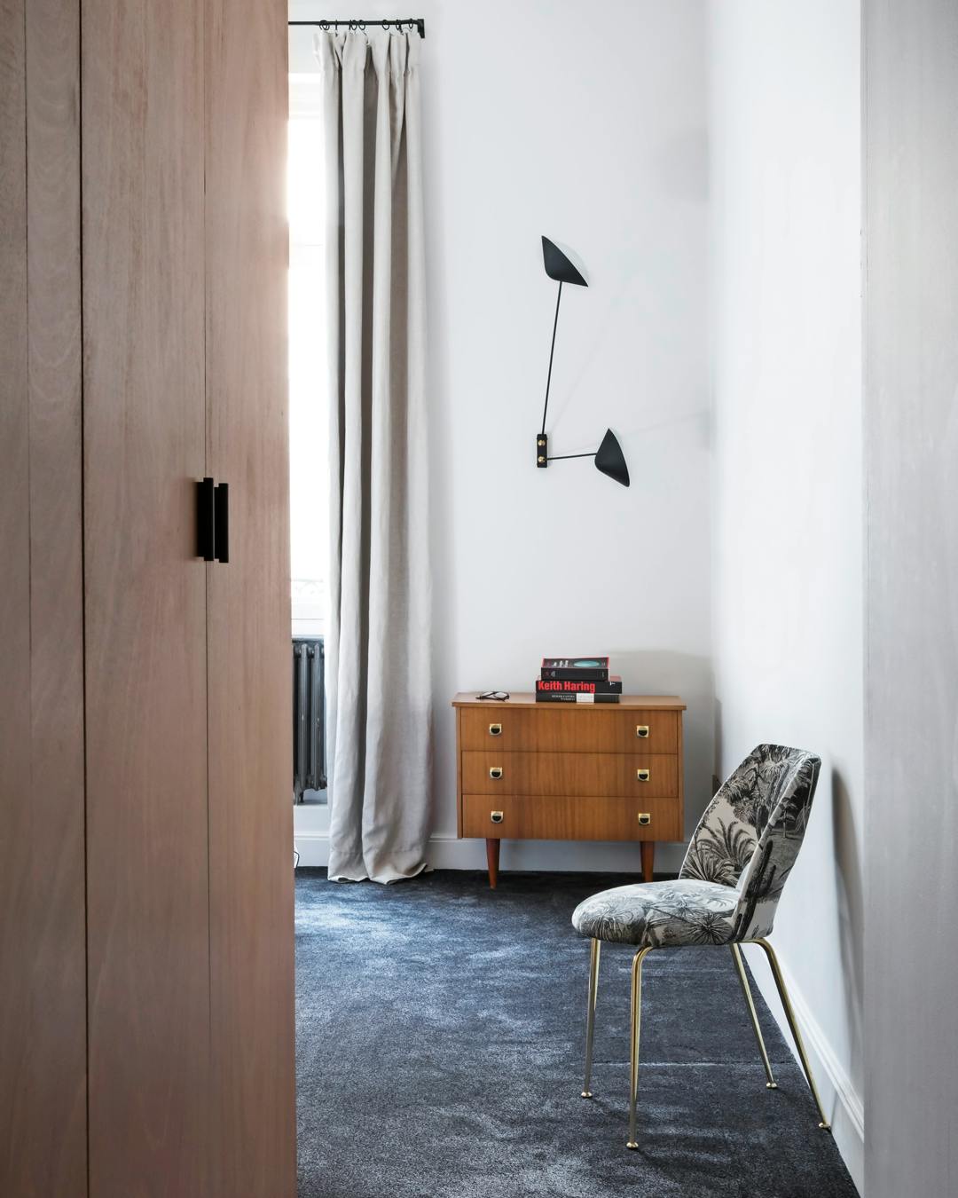 Et væg til væg-tæppe i soveværelset gør rummet mere varmt og hyggeligt. Stolen, der er ombetrukket med stof fra Pierre Frey, er – ligesom kommoden – loppemarkedsfund.