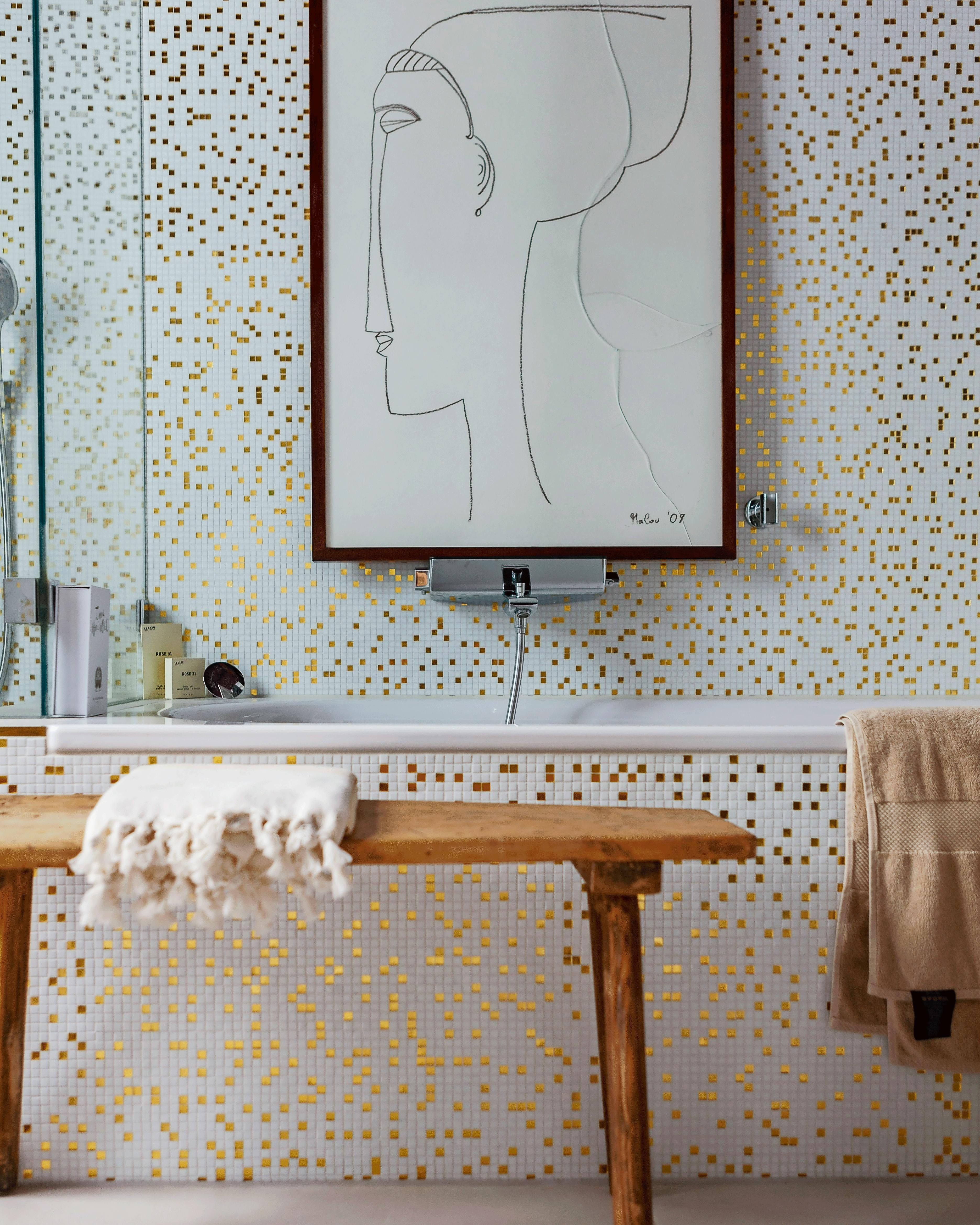Hvide fliser kan sagtens peppes op med vilkårligt placerede fliser i andre farver indimellem – også hvis du ikke er til disko-looket med guldfliser.