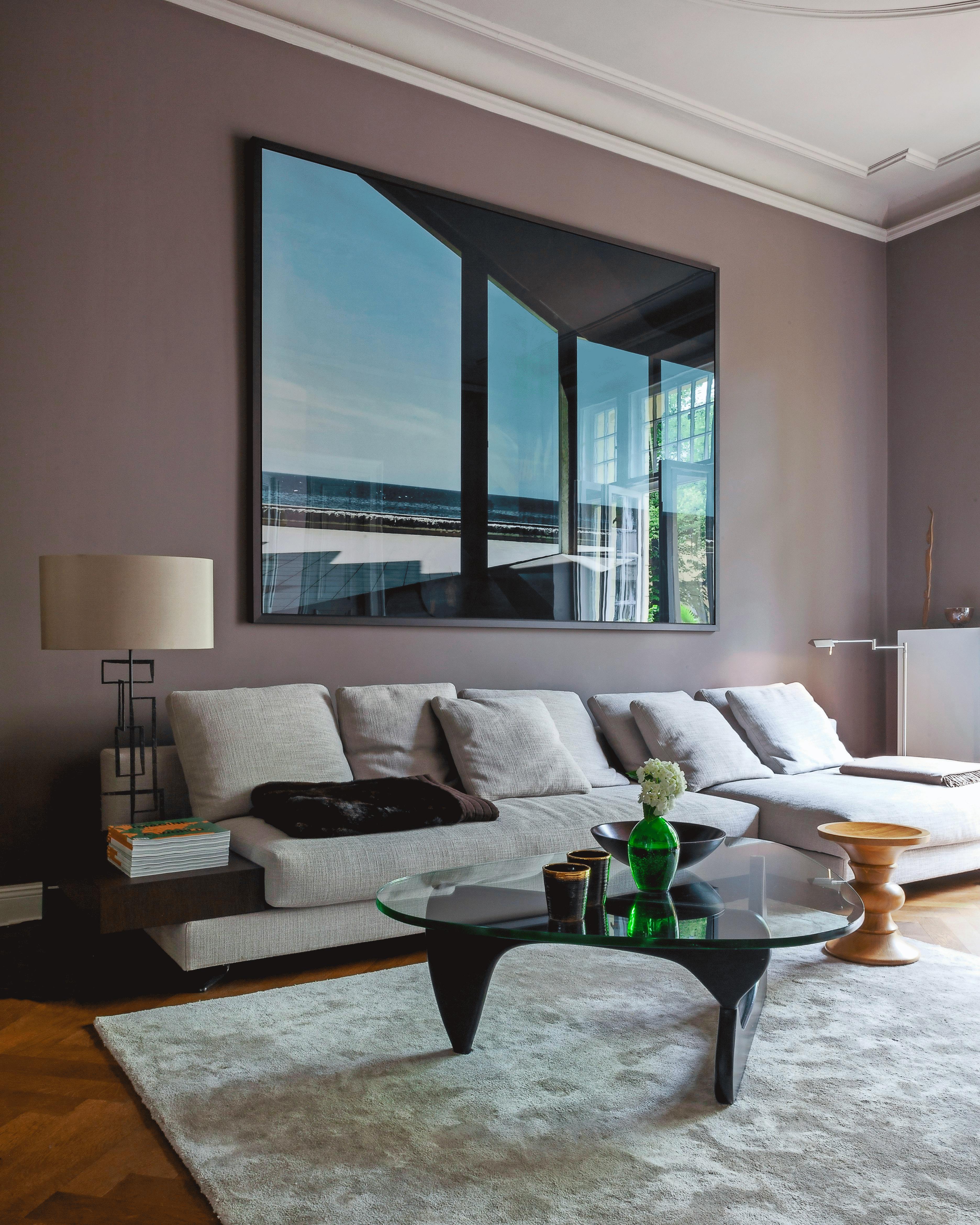 En mørkebrun væg fungerer som en elegant kontrast til lyse møbler, der på den måde kommer i fokus. Sofaen er designet af Rodolfi Dordoni for Minotti, og sofabordet er designet af Isamu Noguchi. Bordlampen er fra Porta Romana, og billedet over sofaen er af Werner Pawlok.