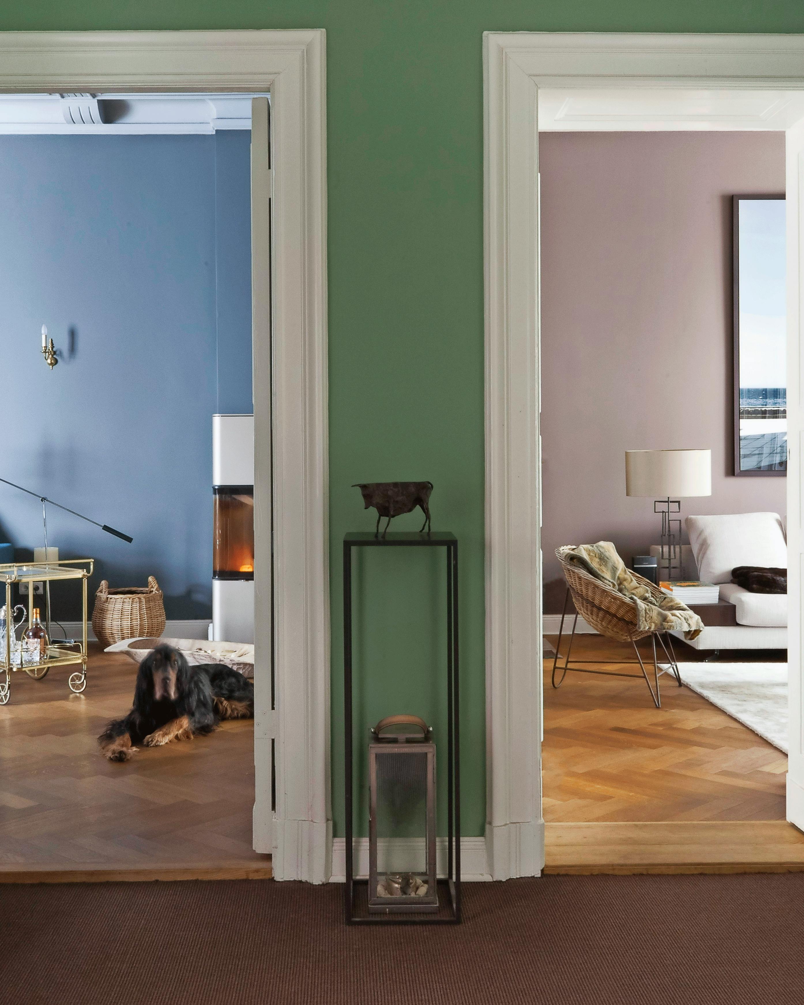 Farvede vægge giver mere dybde end klassiske hvide vægge. Lejlighedens vægge og lofter er malet med farver fra Farrow & Ball, little greene og les couleurs fra Le Corbusier.