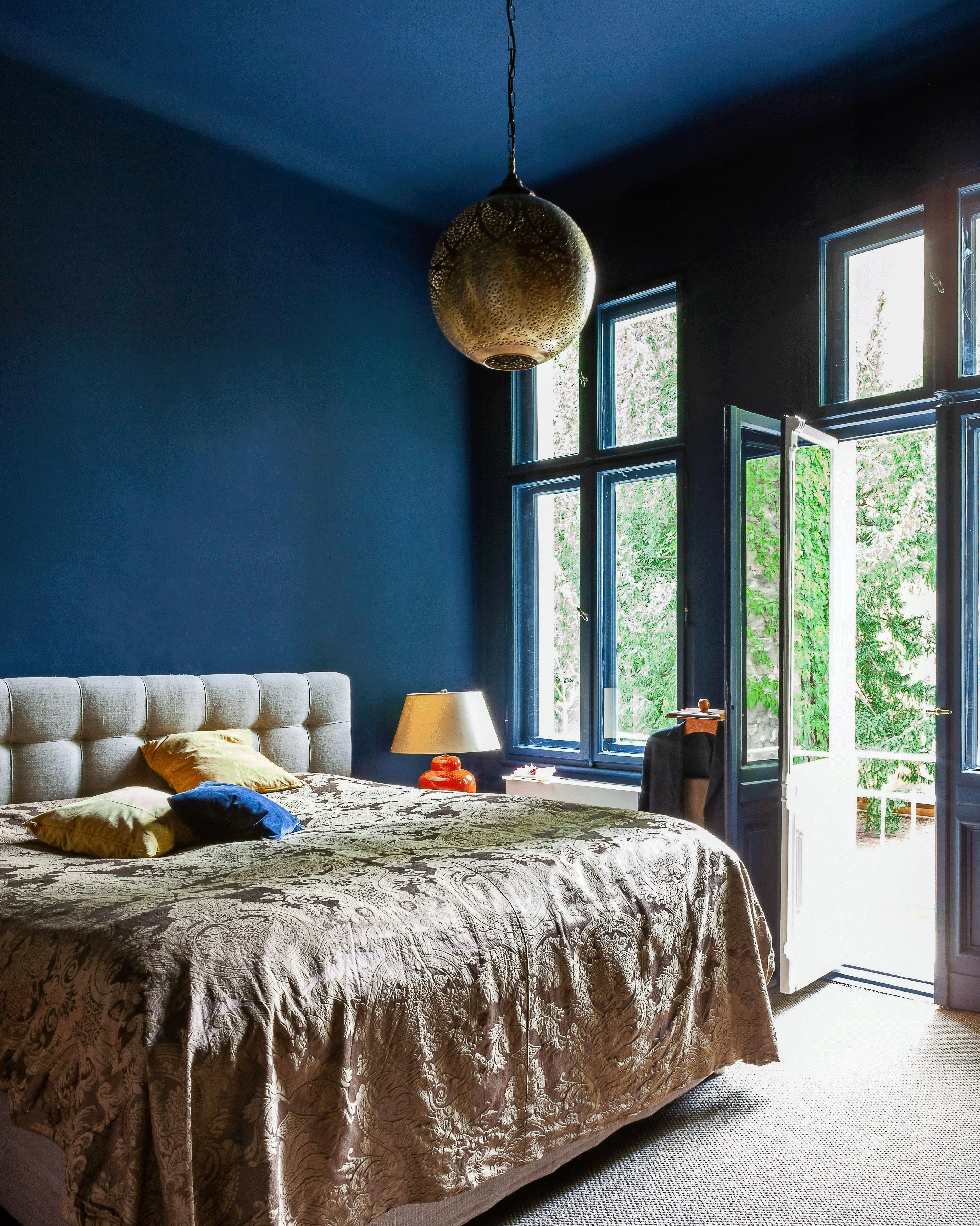 Blå er god til væggene i soveværelset, fordi farven efter sigende stimulerer hjernen til at falde til ro. Skabet er en antikvitet, og loftlampen er fra Marokko.