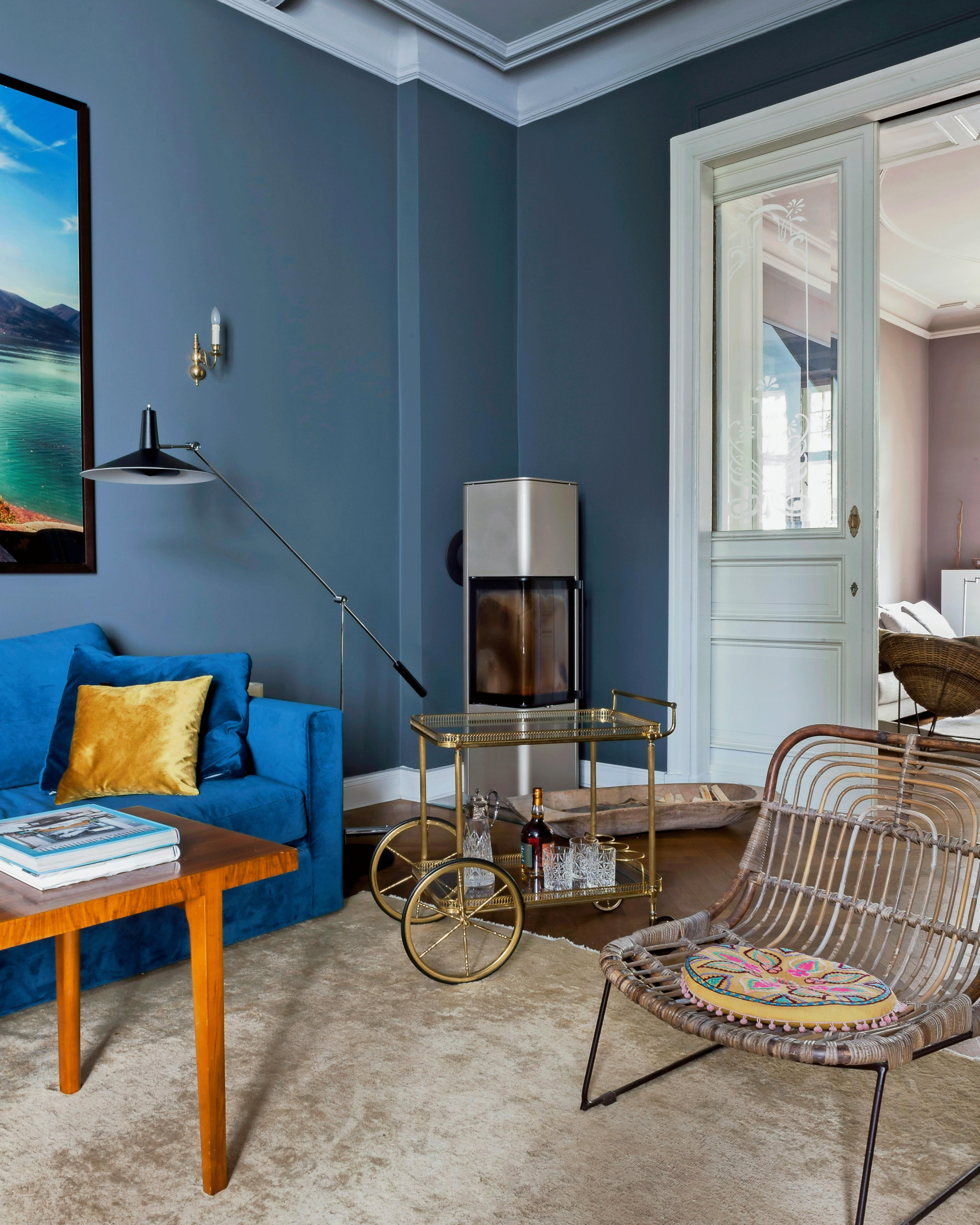 Skab stemning i stuen med en barvogn, der også kan bruges til andet end våde varer. Lignende barvogn kan findes hos Nordal. Den blå sofa er fra Cramer Möbel + Design, og standerlampen er fra Baltensweiler. Sofabordet er vintage fra 1960'erne, og bambusstolen er fra Flamant.