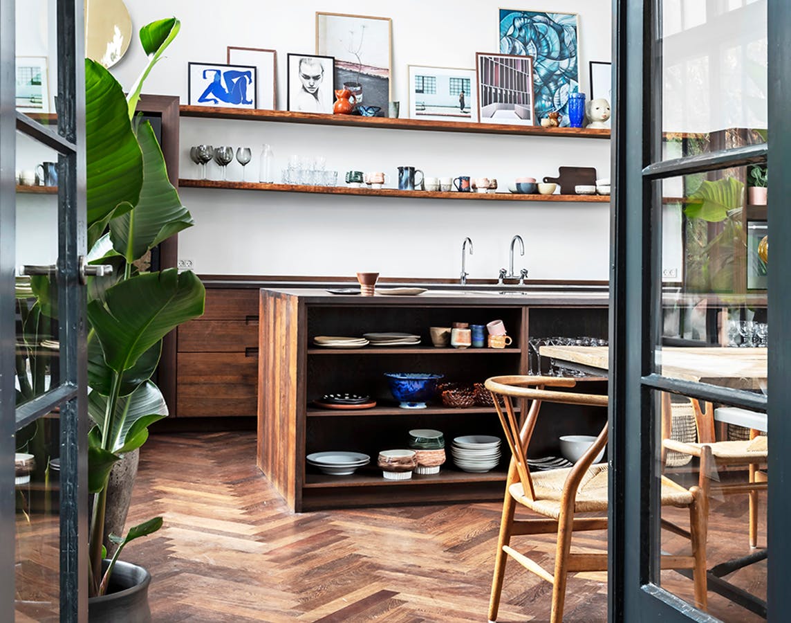 Åbne hylder, der hverken stjæler unødig plads eller dagslys, er et godt alternativ til overskabe, hvis du gerne vil have et lyst og rummeligt køkken. Håndlavet keramik fra Caiob.dk og billeder og fotokunst fra bl.a. Sofie Børsting og Kayser-O.com.