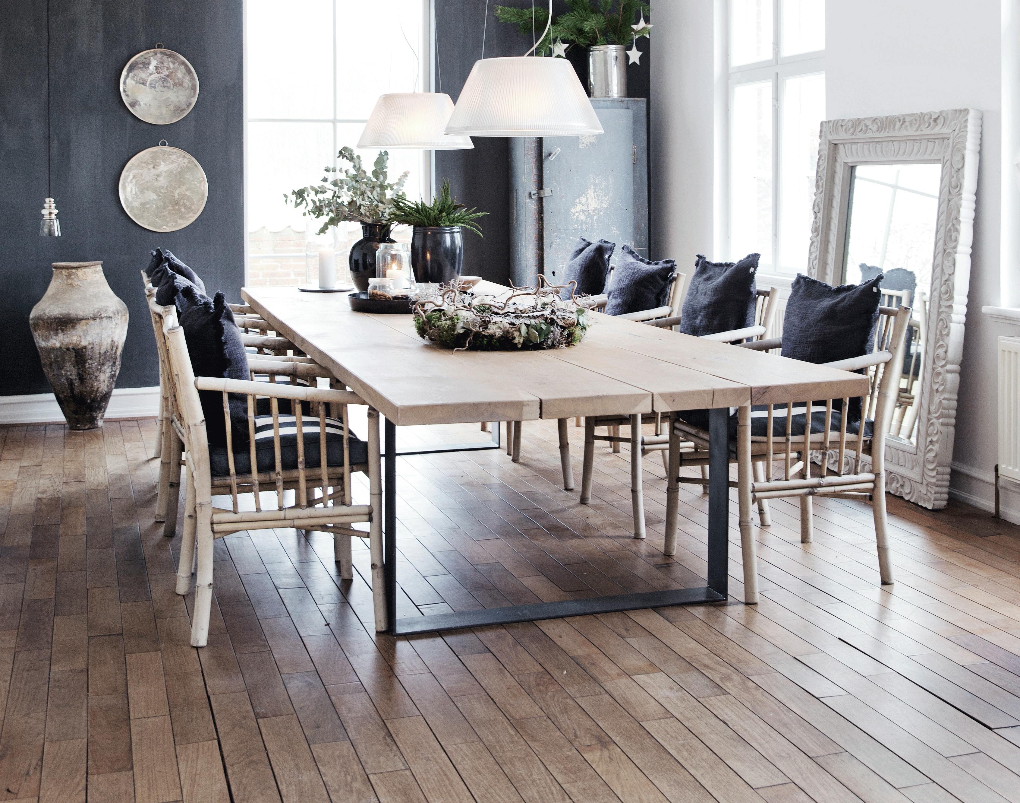 Huset klæder også om til jul. Sofaerne fra Gervasoni har betræk til både sommer og vinter, og både ekstra tæpper og velourpuder bliver fundet frem. Selv spisestuestolene byttes ud – bambusstolene fra Tine K står nemlig ude om sommeren, men flytter ind til vintersæsonen.