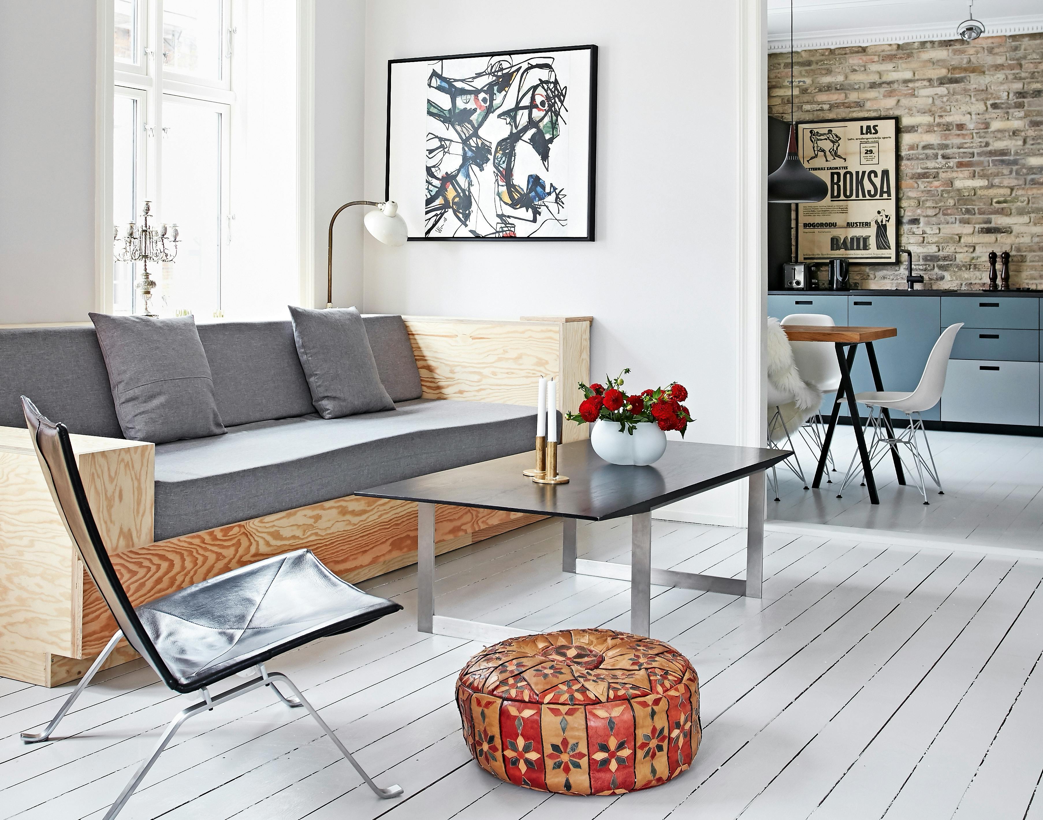 Lejligheden er fyldt med kreative påfund. Et materiale går igen i alle rum. Det er krydsfiner, som ejeren har lavet både senge, sofa og borde af. Inspirationen har han hentet bl.a. i Berlin og i den nye store gør det selv-trend.