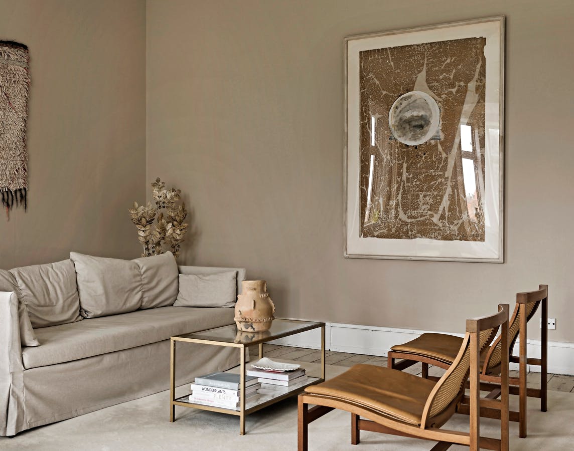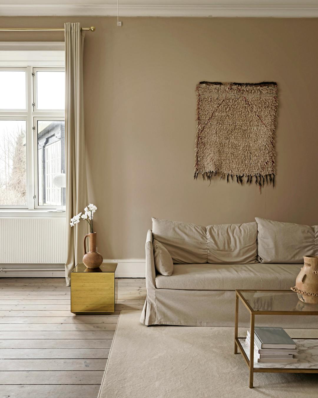 Vælger du at indrette i næsten samme nuancer på vægge og møbler, kan forskellige teksturer såsom velour, metal og flet sat sammen gøre helheden mindre monoton, selvom det er minimalistisk møbleret. Vægfarven hedder sunday mood fra Flügger.