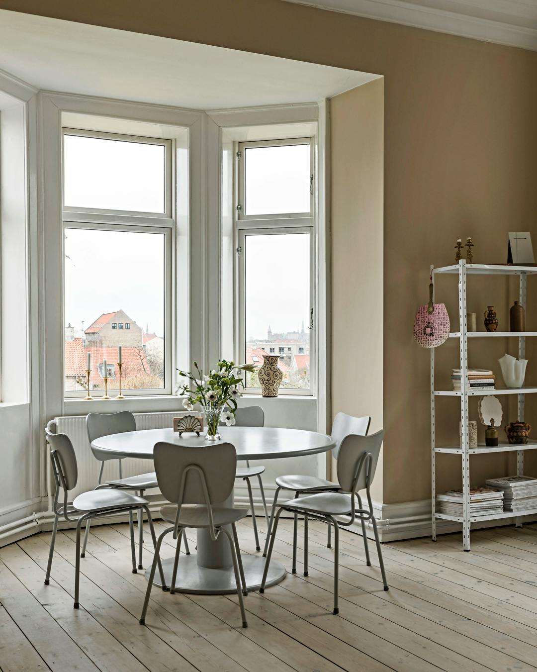 Har du fundet stole og bord i forskellige træsorter, kan det samle spisepladsen, når de bliver malet i samme farve. Så gør det mindre, at de designmæssigt er fra forskellige perioder. I vinduet står en berber-krukke fra Marokko. Fad, servietholder og vase er vintagefund.