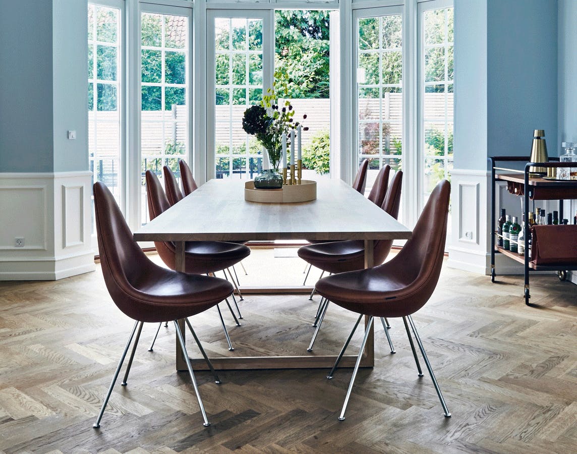Selv om rammerne er den klassiske herskabsvilla, så er selve indretningen nutidig, enkel og moderne. Her er Arne Jacobsen-klassikere som Svanen og spisestolene Dråben, der står rundt om spisebordet, men i høj grad også nyt design.