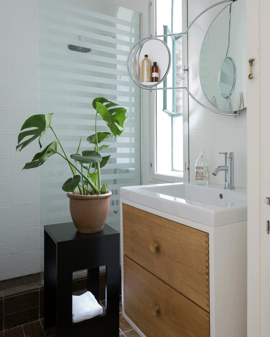 I stedet for den store renovering kan man som her give badeværelset en hurtig makeover i form af et nyt baderumsmøbel, et spejl, en væglampe samt lidt maling. Badmøblet i eg og spejlet Orbit Mirror af Rodney Kinsman er begge fra SkabRum.