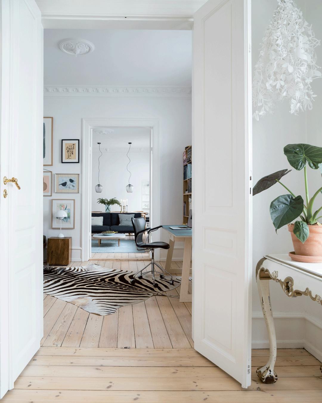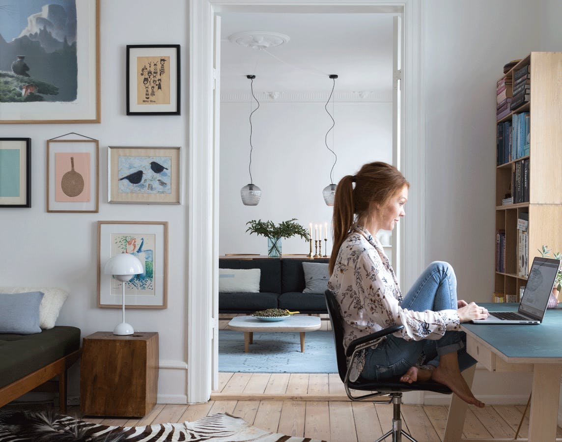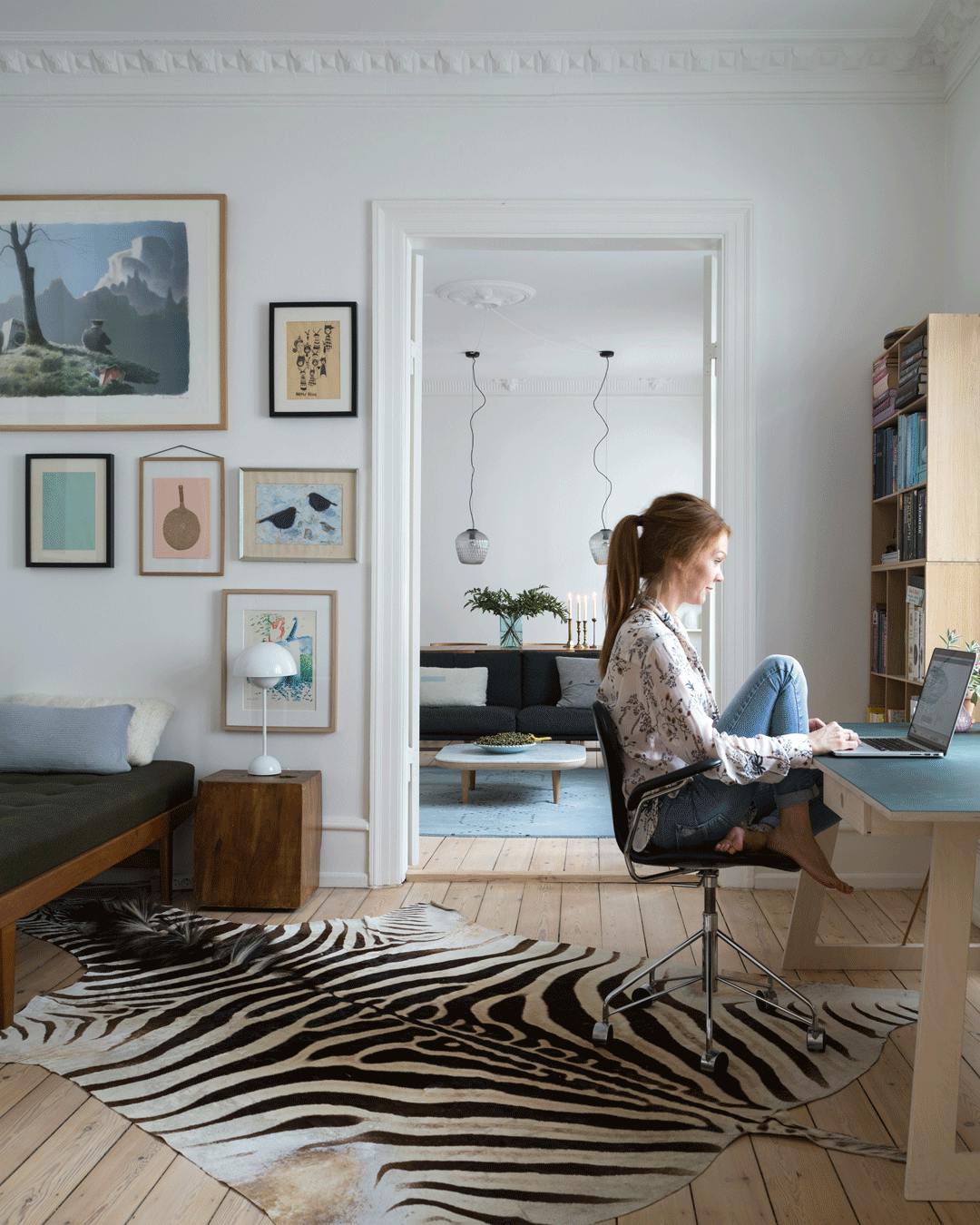 Gør hjemmearbejdsdagene lidt hyggeligere med et lækkert skrivebord. Rummets centrale placering betyder, at familien kan være til stede, selvom der arbejdes. Zebraskindet oå gulvet er et arvestykke, som hans mormor har taget med hjem fra Botswana tilbage i 70'erne.