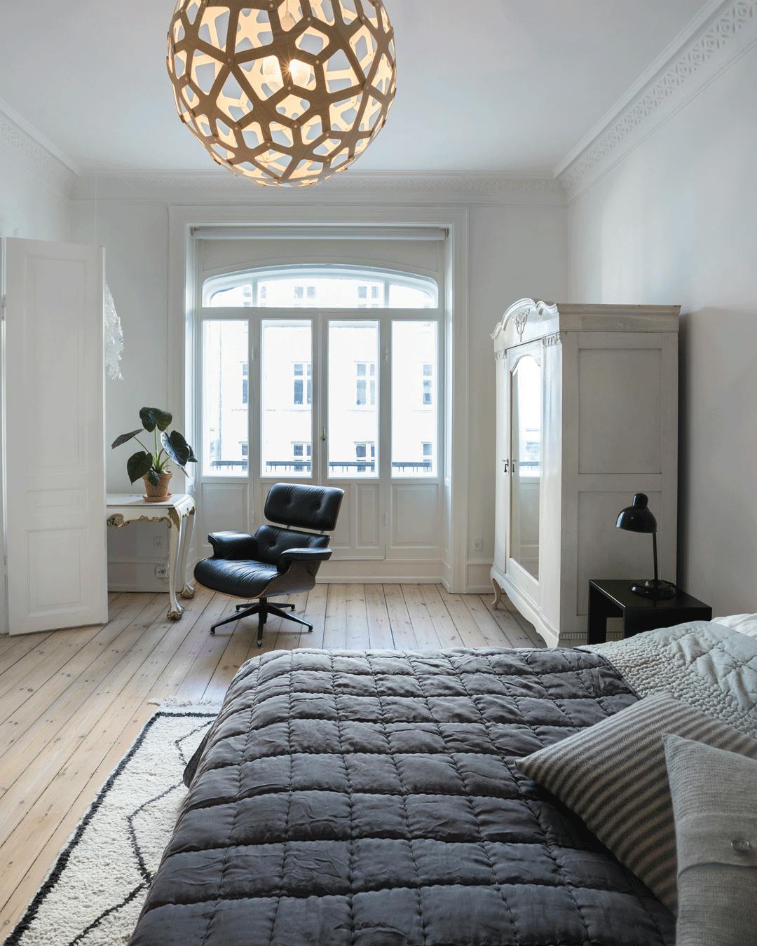 Soveværelset er indrettet med en skøn blanding af nyt og gammelt. Karlekammerskabet er et arvestykke, lænestolen af Charles og Ray Eames, og bordlampen er fra Christian Dell.