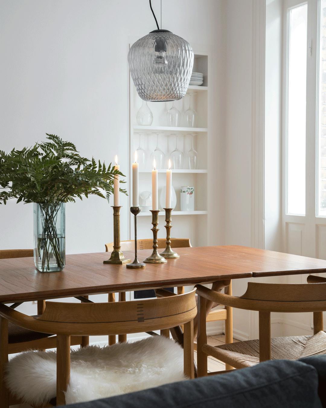 Én gammel lysestage er svær at få til at se godt ud, men hvis du som her samler flere, får du med ét et moderne udtryk. Spisestuen med Hans J Wegners stole PP62 med fletsæde og hans krydsbensbord AT2013 i teak er absolut parrets yndlingssted. Blow-pendelen er fra &Tradition.