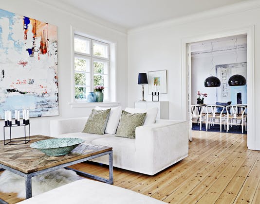 - Vælg en lys grundfarve i dine rum og pynt med dæmpede farver, så du får et lyst og luftigt hjem.