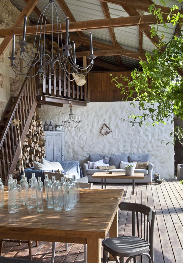 Terrassen udenfor er i dag familiens omdrejningspunkt. Der bliver brugt masser af tid på alt fra afslapning i hængekøjen til lektielæsning i sofaen og hygge omkring det store spisebord. Men da parret overtog huset, var terrassen dækket med leret jord og fyldt med mudder. Derfor har parret brugt lang tid på at gøre den anvendelig. De har bl.a. fået sat en dør i væggen fra køkkenet, så man kan gå direkte derud og dermed husker at få den brugt. Der blev også lagt nye terrassebrædder, og de rå vægge blev kalket hvide, så de fremstår lyse og imødekommende.