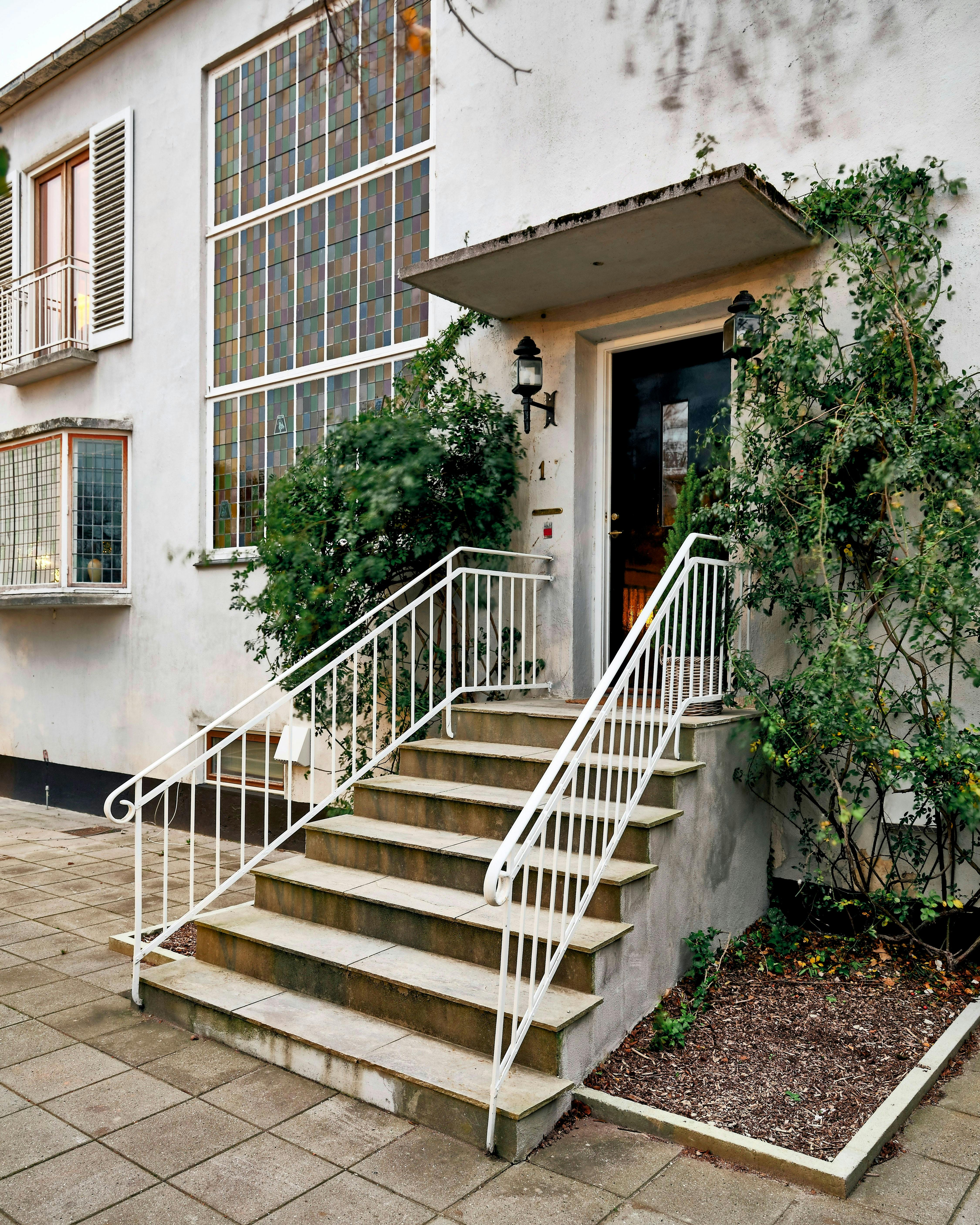 Teknikken med at lave blyindfattede ruder prægede mange bygninger i 1920'erne og 1930'erne. Kurvesofaen fra Bo-Tikken er betrukket med tekstil købt i England. Standerlampen AJ er designet af Arne Jacobsen, og i vindueskarmen står glaskeramik fra A-Huset og en bordlampe af Isamu Noguchi. Lampen i loftet er fra Ay illuminate.