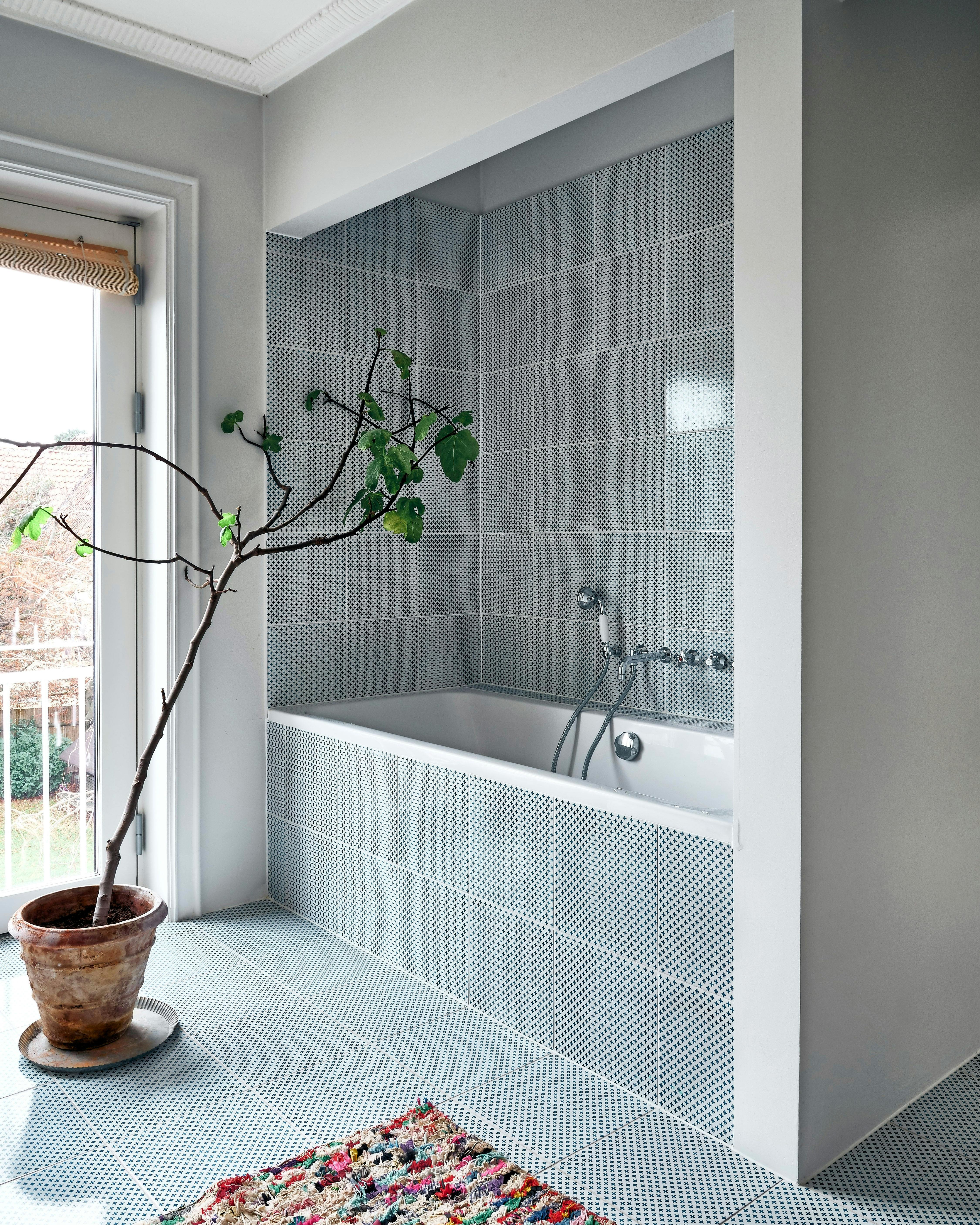 Det giver en særlig effekt at sætte fliser på både gulv, badekar og væg. Flisernerne her er fra Made a Mano og armaturet fra Toni.