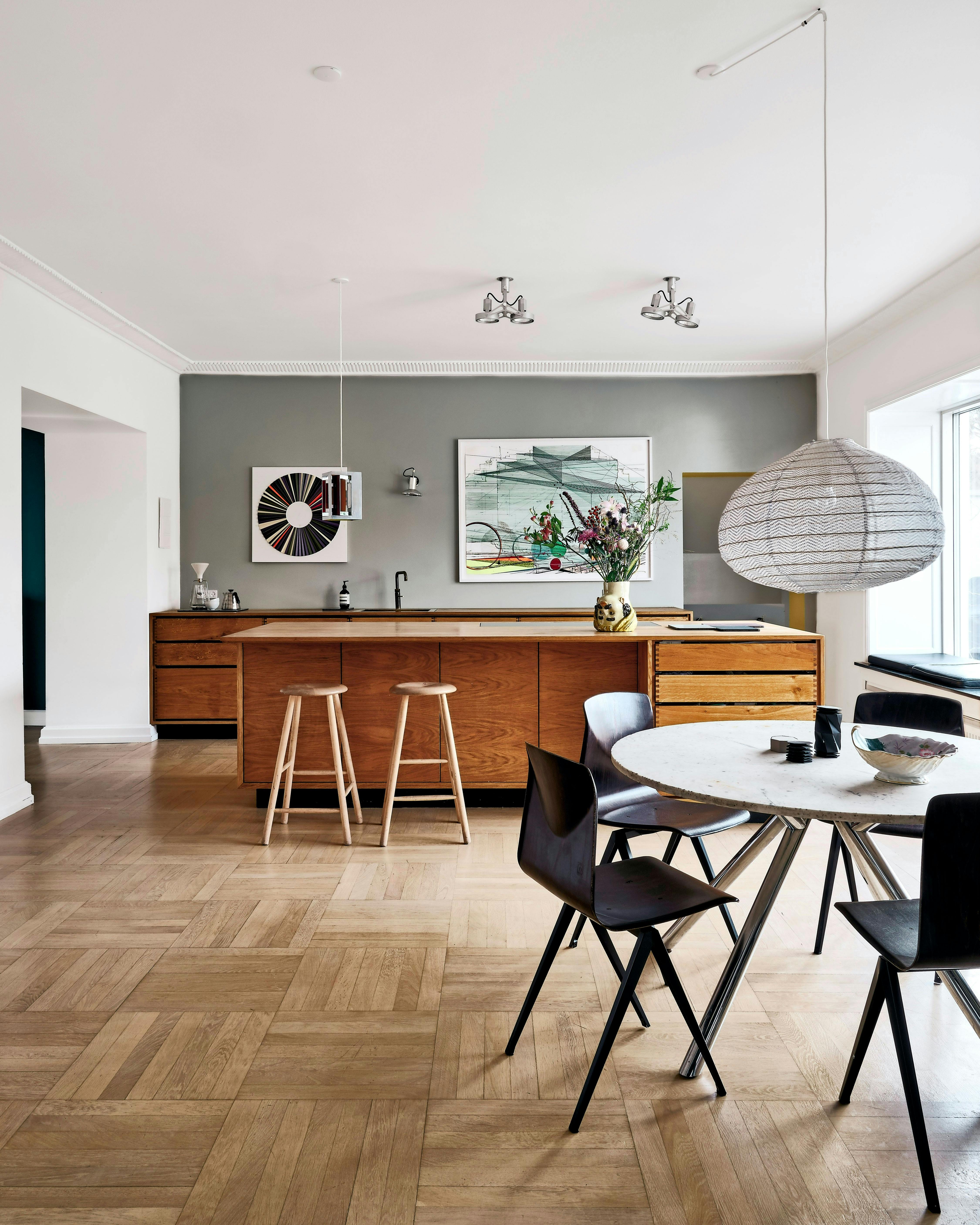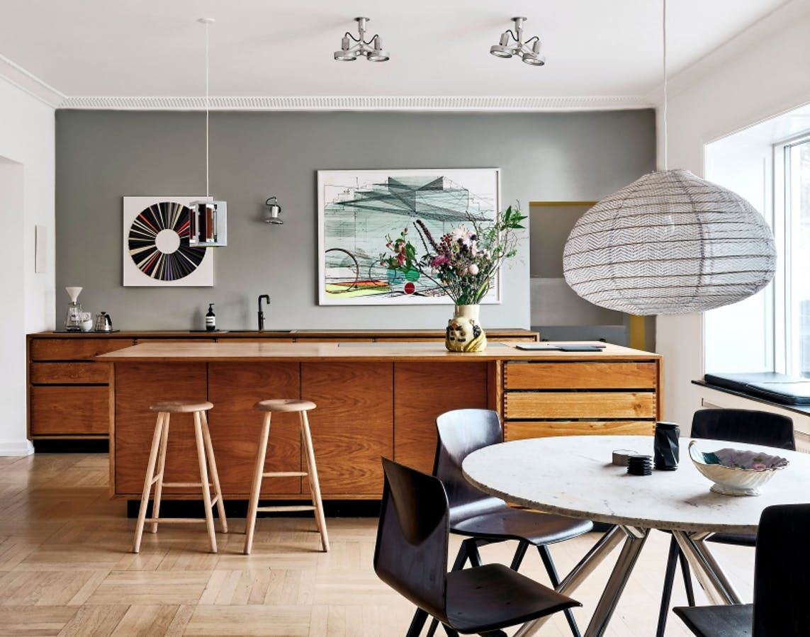 Snedkerkøkkenet er bygget af en ven af familien. På bagvæggen hænger et værk af Jay Gard fra Gether Contemporary og et stort værk af Ferdinand Krag. De brune Pagholz Galvanitaz S19-spisebordsstole er vintage, spisebordet er et arvestykke, og på det står Gosthly Internationals Urogami Edition af Matthew Schlian samt en vintageskål. Lampen over bordet er Kyotolampen fra Paris au Mois d’Aout.
