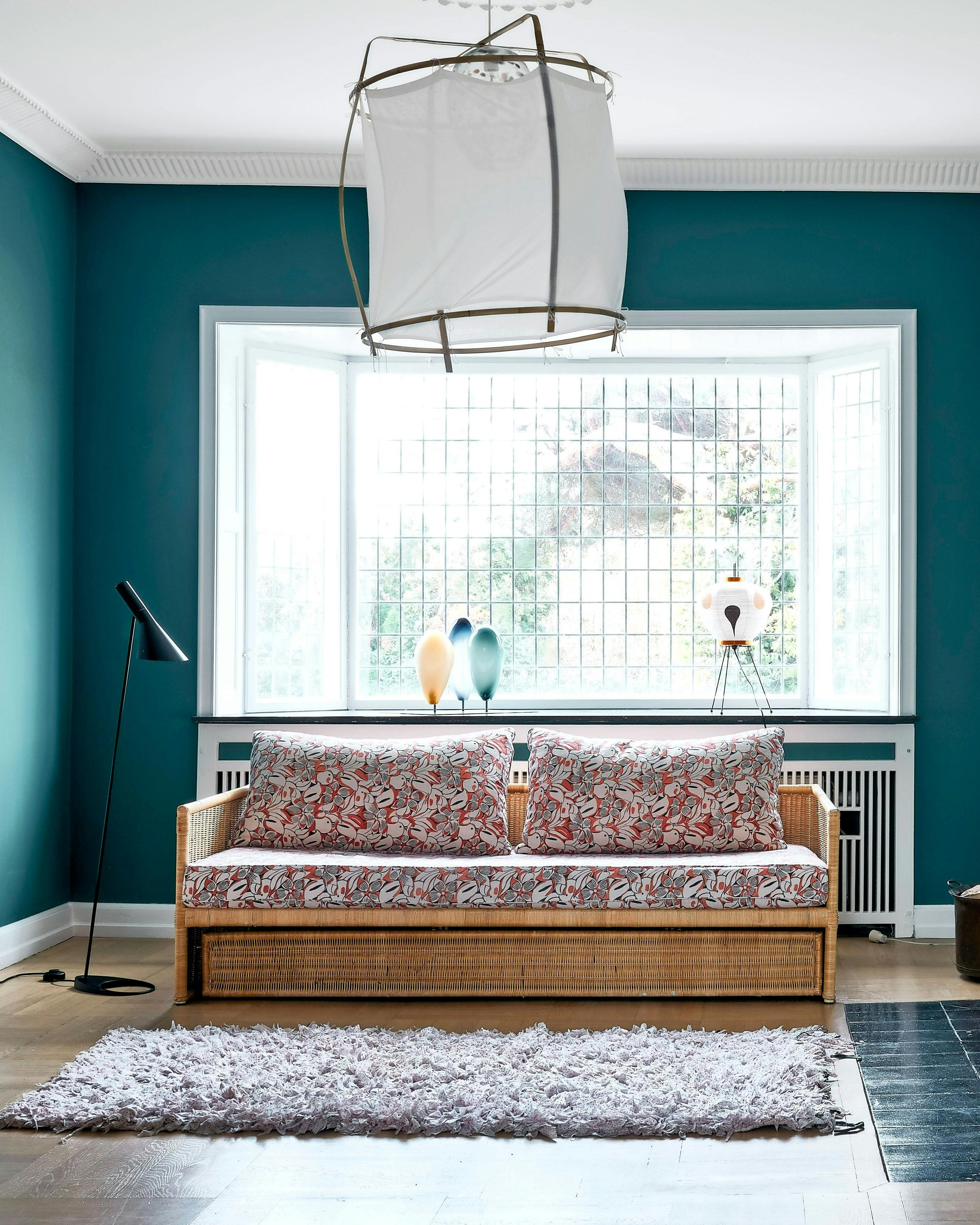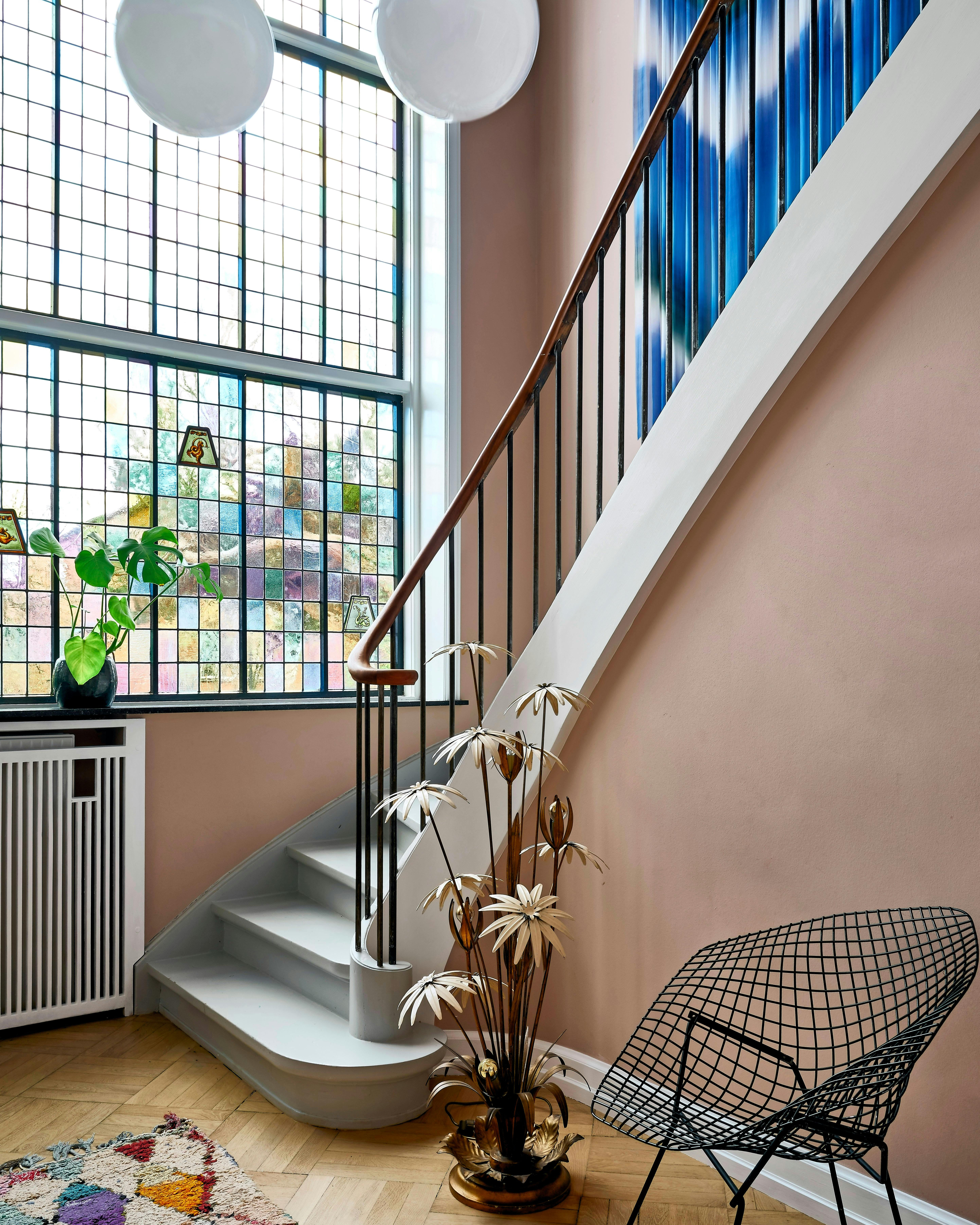 Fremhæv originale detaljer ved fx at lege videre med farverne i blyindfattede ruder. Tekstilværket er af Justin Morin fra Peter Ambys Last Resort Gallery. Stolen Diamond Chair er af Harry Bertoia, blomsterlampen på gulvet er købt på loppemarked, og lamperne i loftet er fra Wilhelm Lauridsen.
