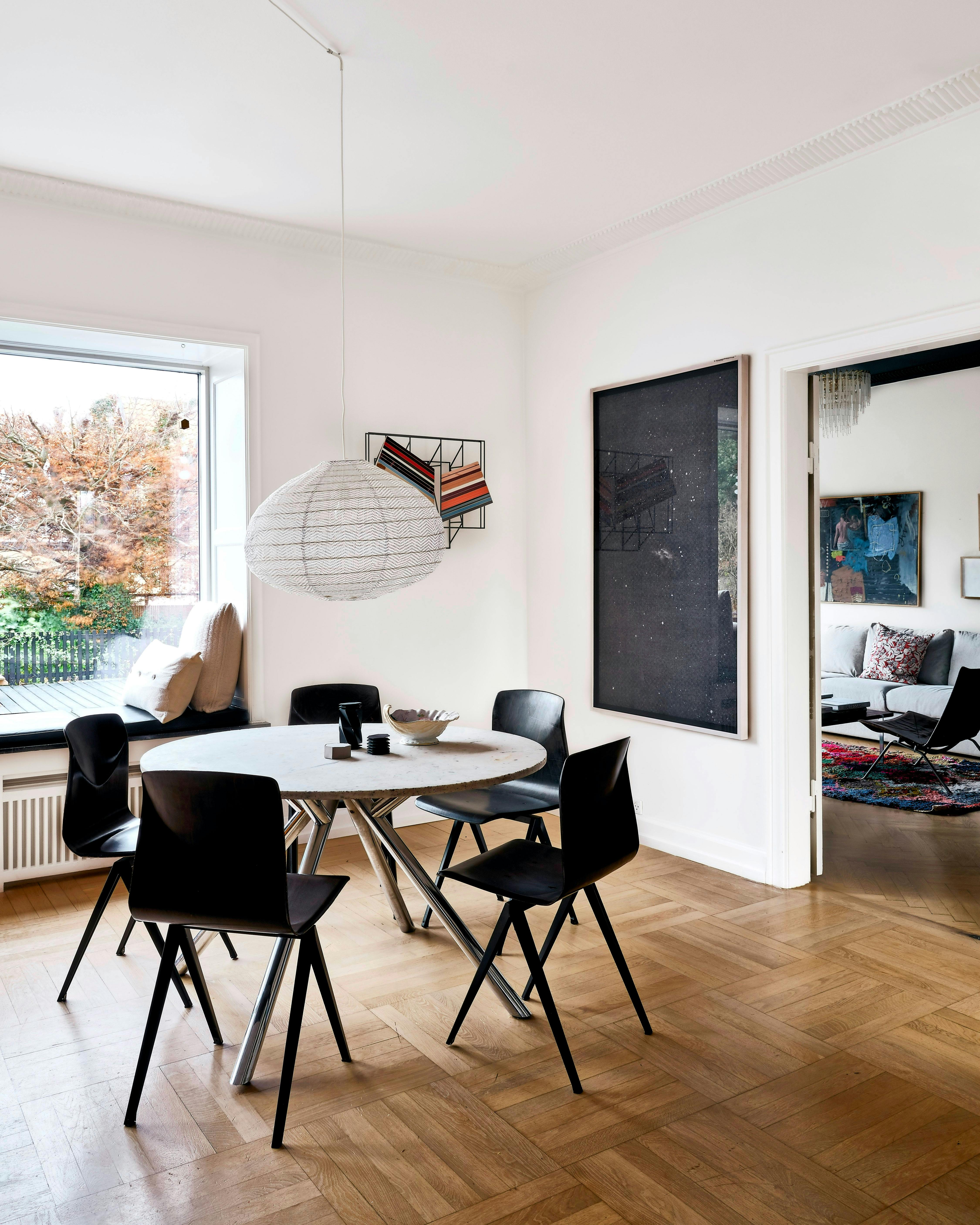 Gå efter designklassikere der passer til en nutidig stil, men som kan holde en generation og naturligt indgå i et skiftende hjem. Spisebordet og de brune Pagholz Galvanitaz S19-spisebordsstole er vintage. På væggen hænger et farverigt værk af Jay Gard fra galleriet Gether Contemporary og et stort sort/hvidt fotografisk værk af Emil Salto fra galleriet Last Resort.