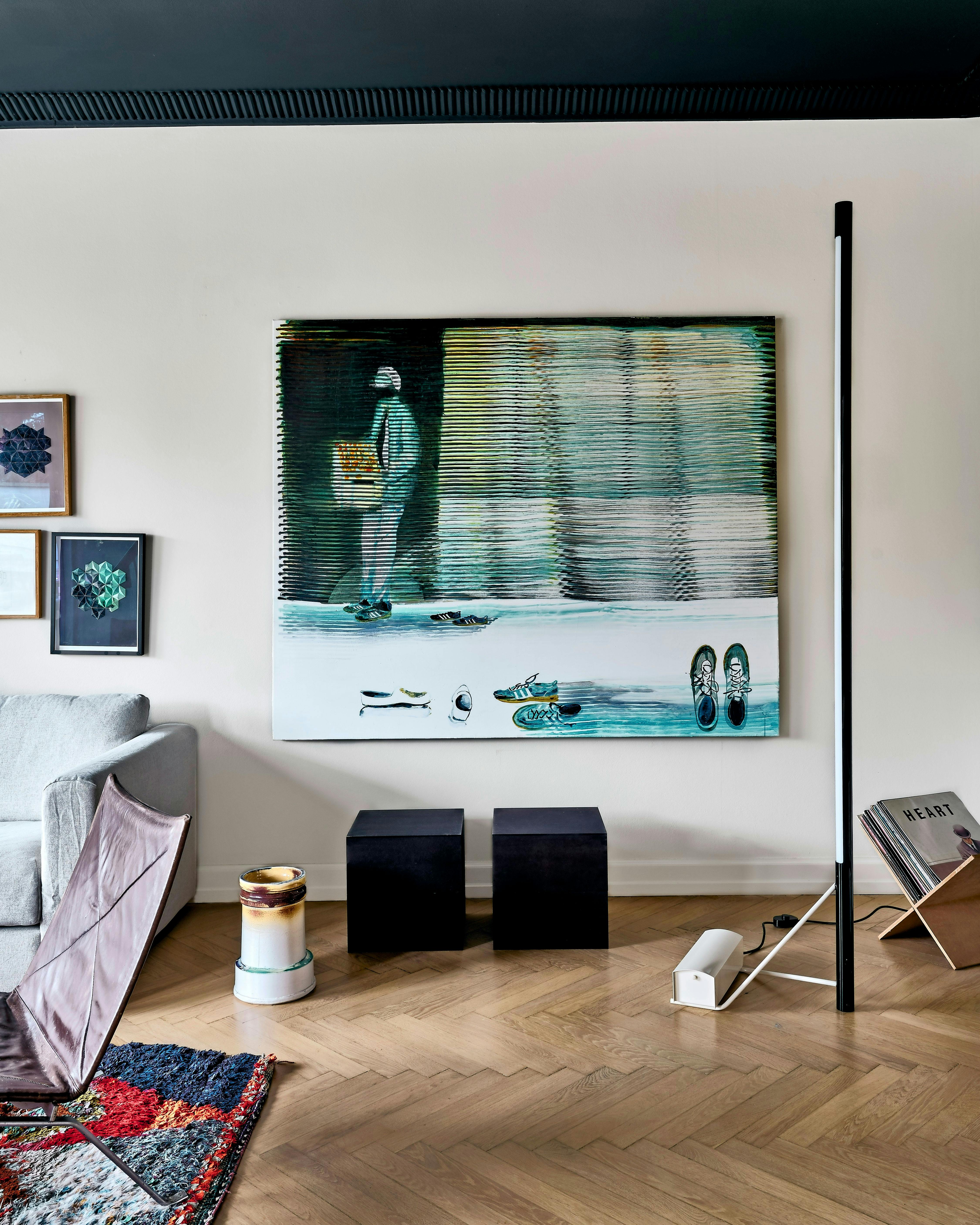 Det kan betale sig at besøge mindre gallerier og ukendte steder, hvis du drømmer om ægte kunst på væggen. Over vinylkasserne hænger et stort værk af John Kørner. Lampen Model 1063 er fra Astep og designet af Gino Sarfatti.