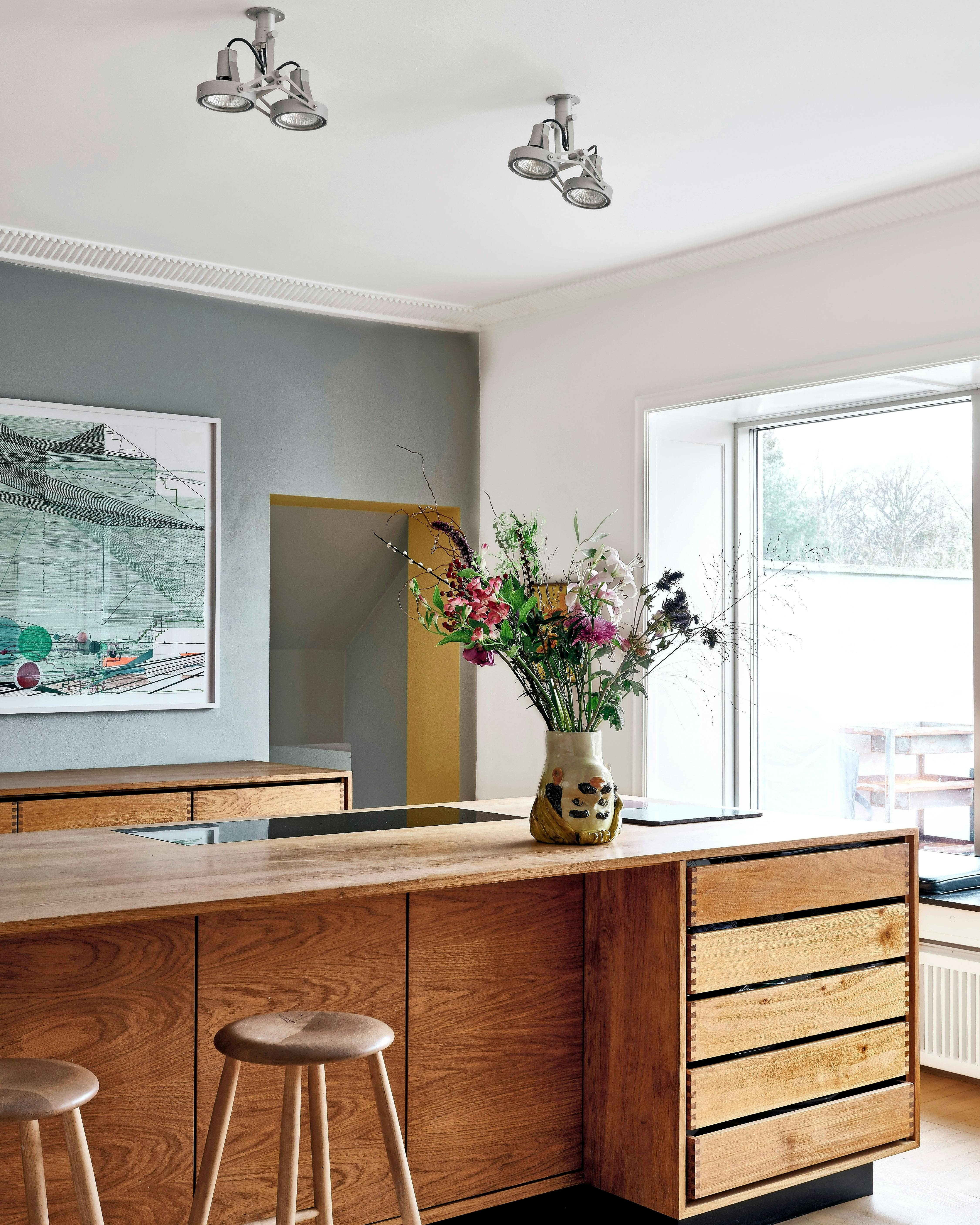 En enkelt farvet væg kan være nok til, at rummet får mere kant samt fremhæve et kunstværk. Værket er af Ferdinand Krag. Lampen over øen er en vintageversion af Casablanca fra Lyfa. Taburetterne er fra Ikea, og 'hovedvasen' er af ChristaSeya x Giacomo Alessi fra The Apartment.