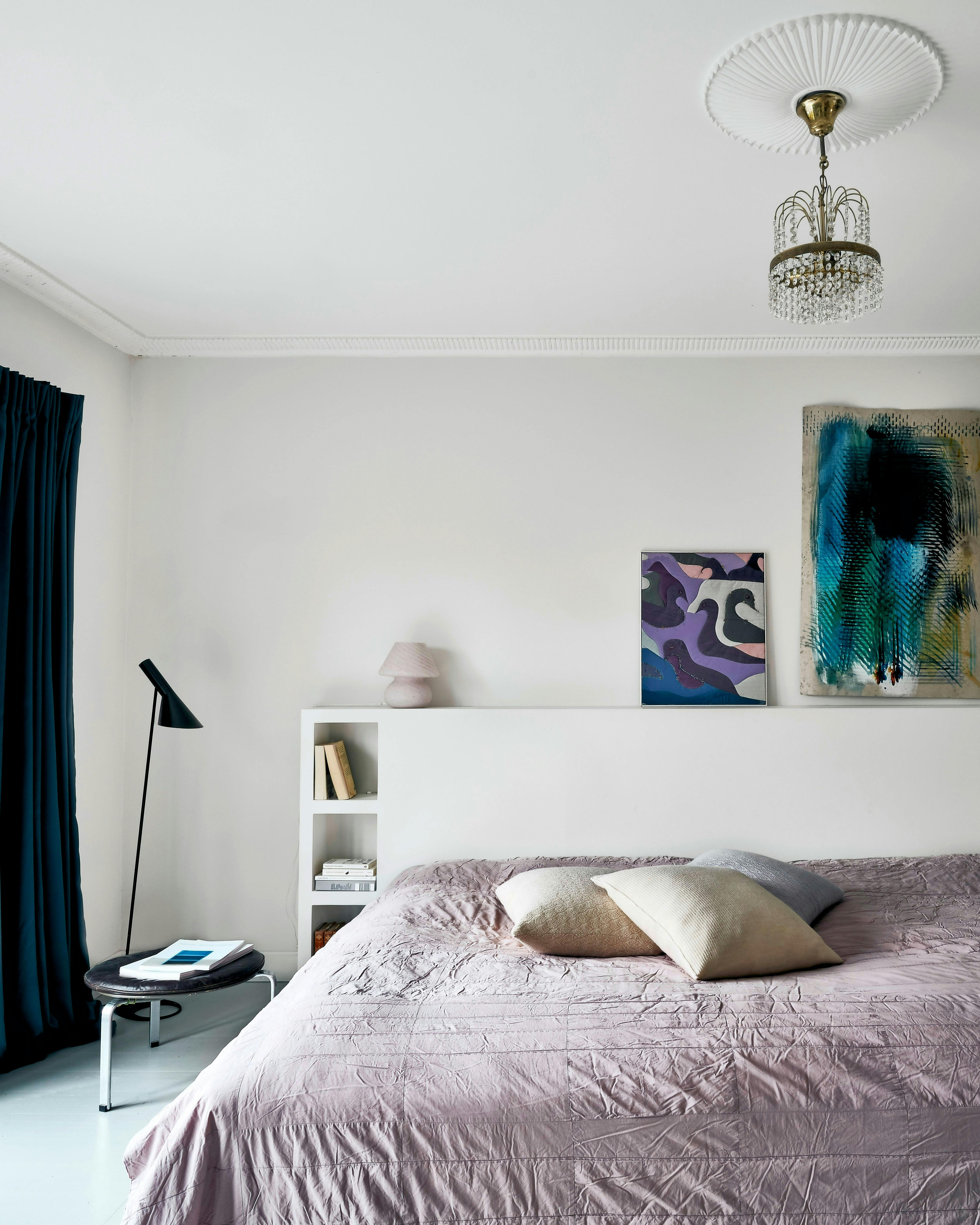 En indbygget reol bag sengen kan fungere som hovedgærde og samtidig bruges til at sætte ting på. Kunstværkerne er fra Siljangade. Skamlen er af Poul Kjærholm, og AJ-gulvlampen er af Arne Jacobsen. Den rosa glaslampe er vintage, og i loftet hænger en vintage-krystallampe.