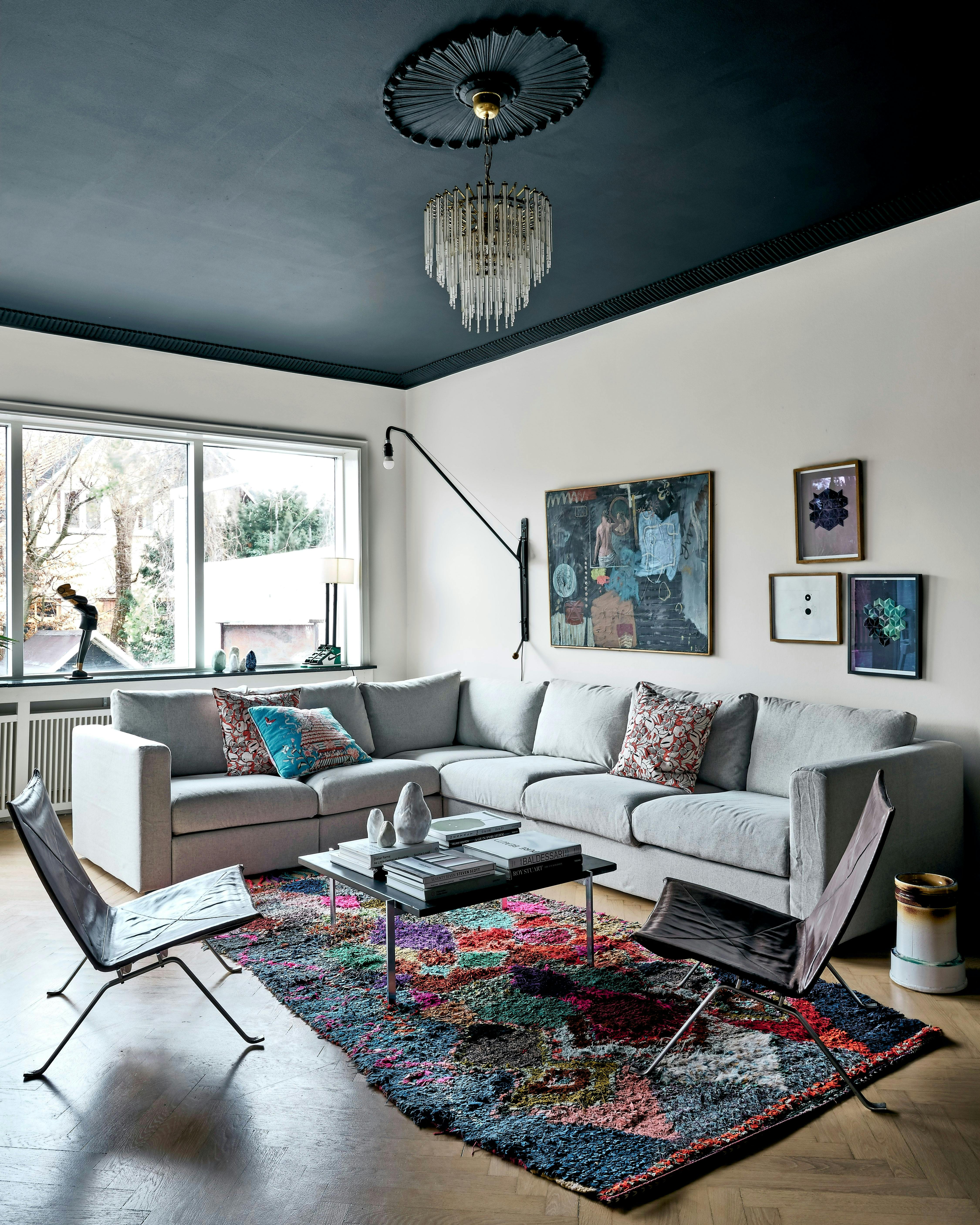 Det giver en anderledes effekt at male loftet. Stolene og sofabordet er Poul Kjærholms PK22, sofaen er fra Ikea. Væglampen er Potence Lamp af Jean Prouvé og maleriet af Bror Larsen og Geoff McFetridge. Det marokkanske tæppe er vintage.