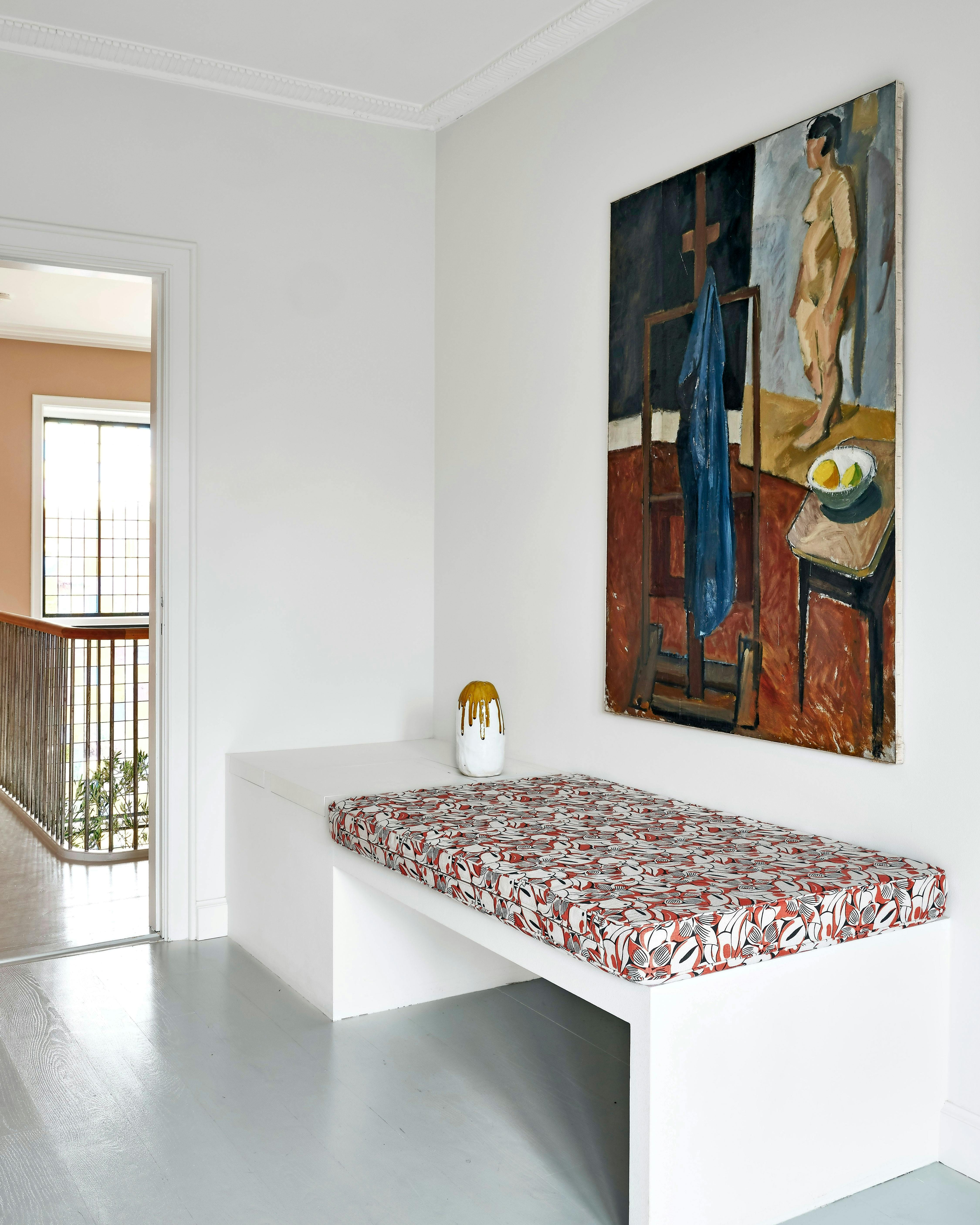 En indbygget bænk får møblet til at glide i ét med arkitekturen og giver en ekstra afsætningplads fx i soveværelset. Over bænken hænger et værk af Jais Nielsen, som er et yndlingsarvestykke.