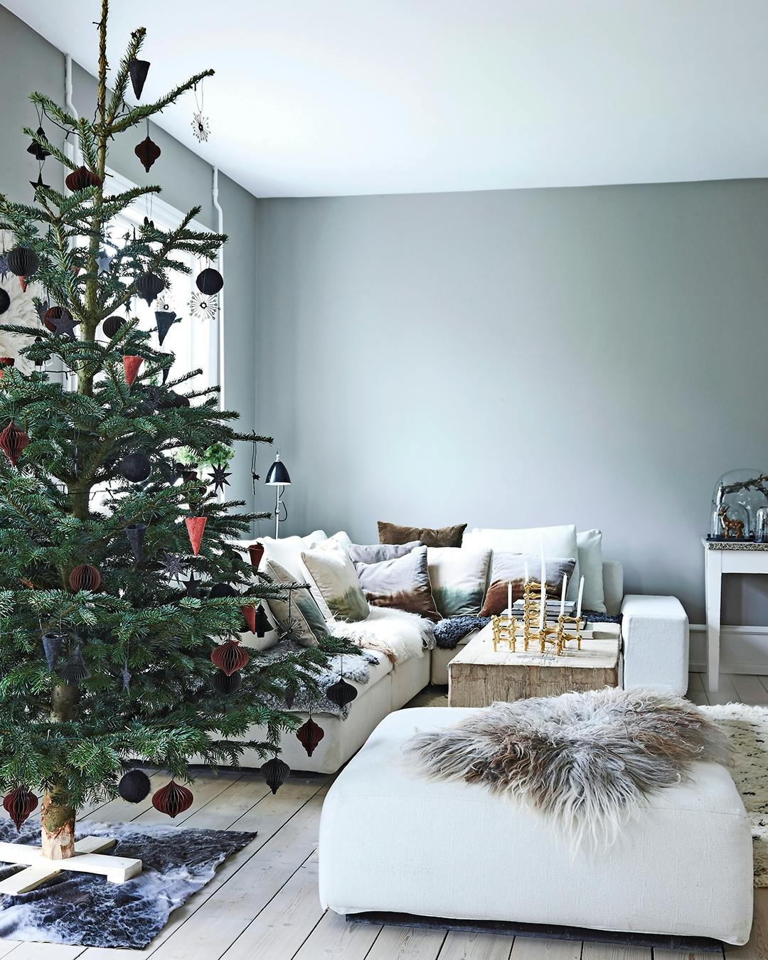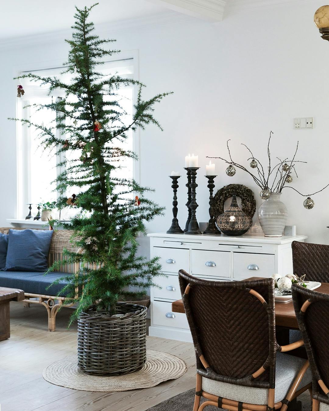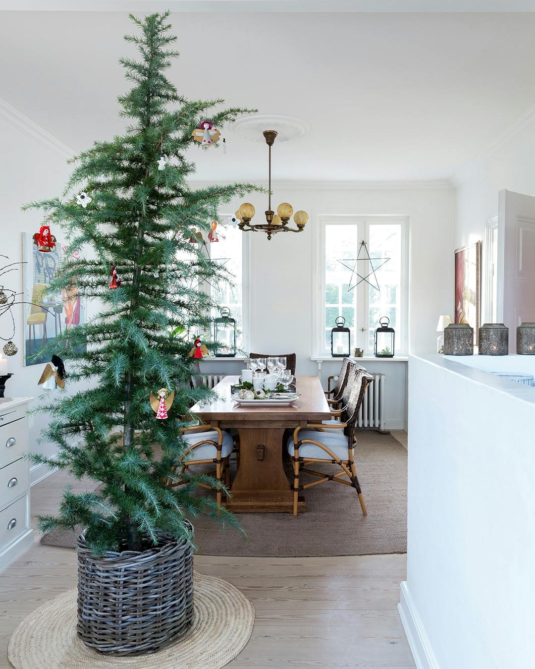 Køb et træ i en potte – så taber det ikke nålene i løbet af december, og du kan sætte det ud i naturen efter nytår. Potten er stillet i en stor flettet kurv, der er let af bære rundt på. Pynten er sparsom for ikke at tage fokus fra det grønne. Juletræstæppet er som stager, kurv, lanterner og spisebordsstole og spisebord fra Sika-Design.