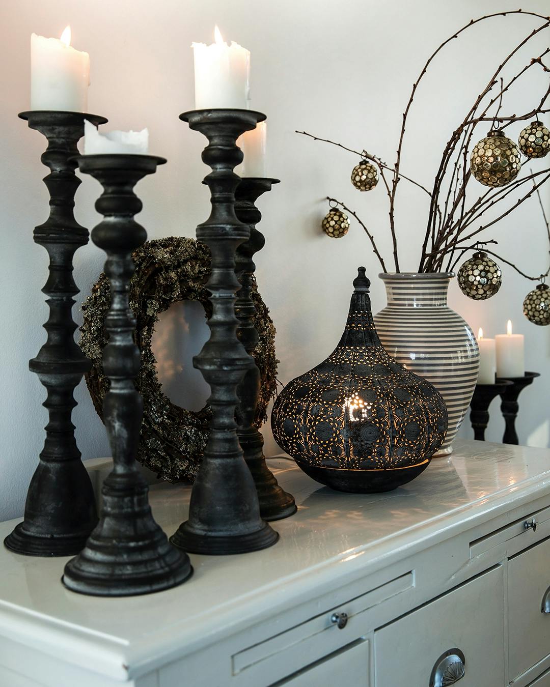 De hulmønstrede lanterner sørger for et smukt lysspil i hele spisestuen hver aften. Selv om der er mange ting på skænken, virker det ikke som for meget, da stager, lanterner, julekugler og vaser er i samme farveskala.