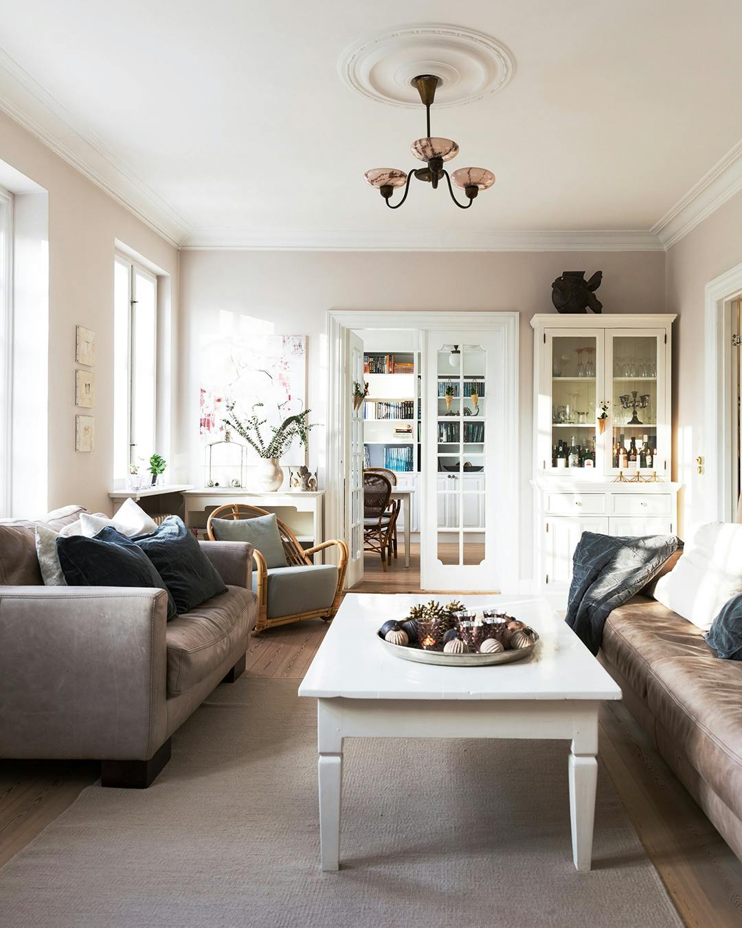 I den lange, smalle stue er der blevet plads til et par store, håndsyede lædersofaer fra italienske Dinger. Bordet har Louise malet hvidt, mens messingfadet er fra Tine K home. Puder og tæpper er fra Sika-Design, mens glaspendlen er vintage.