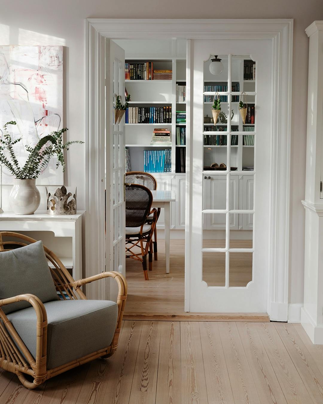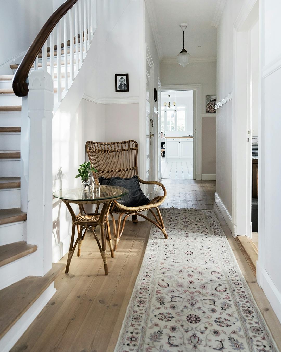 De mange møbler i rattan, bløde tæpper på gulvene og vintageglas-lamper i loftet giver en afslappet stil i den lange mellemgang, hvor det er let at føle sig hjemme. Stol og bord fra Sika-Design, glaspendler købt vintage på et loppemarked i Djakarta, mens tæpper er fra Tine K Home.