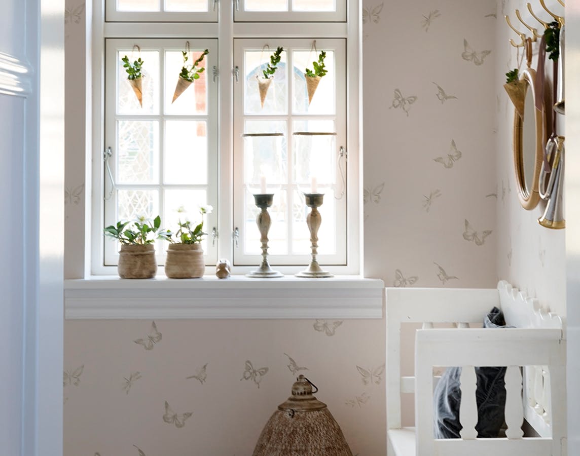 Lyserøde vægge flere steder i boligen understreger den feminine og romantiske indretning, der giver god modvægt til kønsfordelingen i huset, hvor Louise er eneste kvinde blandt en mand og tre store sønner. I et hjørne i stuen er der indrettet en læsekrog med Charlottenborg-stolen, der er tegnet i 1936 af Arne Jacobsen. Maleriet er lavet af Louises søster Rikke Line Andreasen.