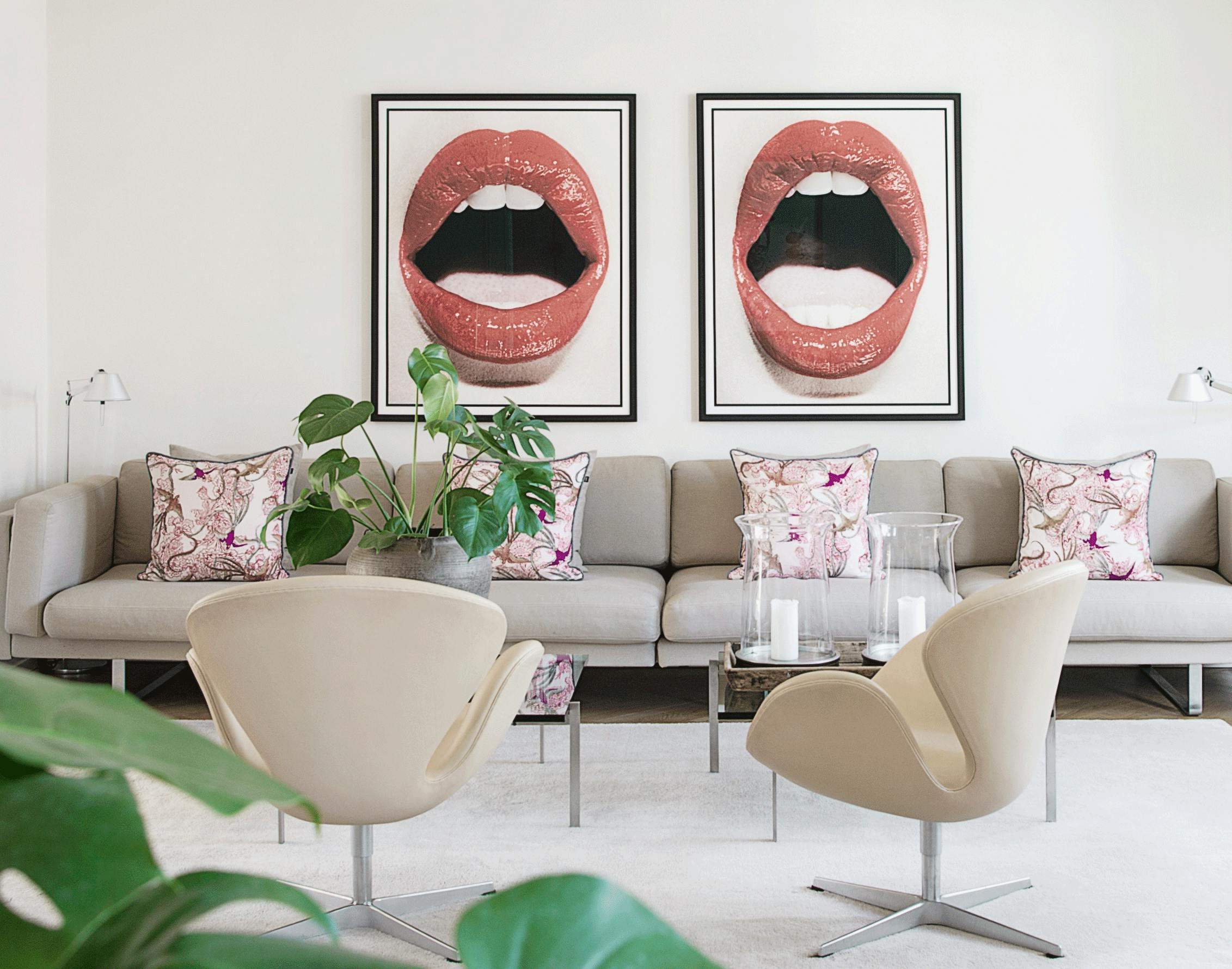 Med fotokunst og reklameikoner læner stilen sig lidt op ad en underspillet 70'er-vibe, der bliver understøttet af velourpuder og en skulpturel puf, der giver et mere taktilt look i stuerne.