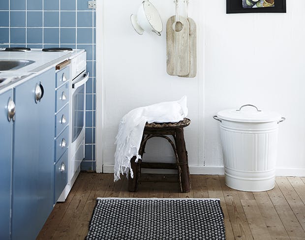 Himlen var høj, havet blåt og køkkenet ligeså, da Mette Wotkjær og Jakob Helbig for 12 år siden forelskede sig i sommerhuset og købte det i en ruf. Faktisk købte de det sammen med Mettes forældre, der bor i Jylland og derfor måtte skrive under som medejere uden at have set andet end ejendomsmæglerens forherligende billeder. Og så fik Mette og Jakob ellers travlt med at rydde op, smide ud, ordne og male det søde, men reelt noget nussede og nedslidte hus. Se også: Charmerende sommerhus i Tisvilde