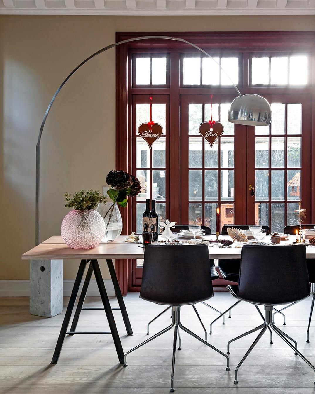 Ud over en smule glimmer består pynten hovedsageligt af kugler og naturlige elementer såsom lærkegrene, kogler og mos. Tine Kjeldsen kan også godt lide at pynte op med glas, som kaster reflekser i den gamle lægebolig på Fyn.