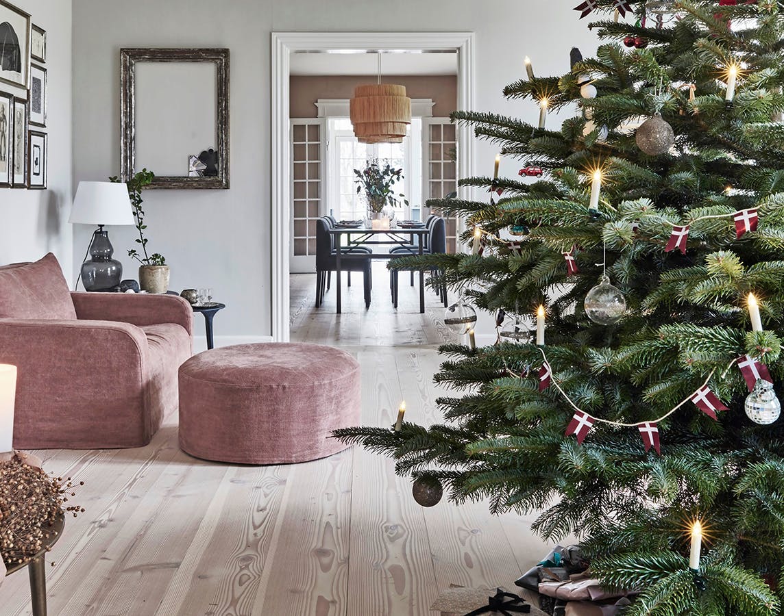 Et juletræ er smukt i sig selv, og derfor er det ikke altid nødvendigt at overdynge det med pynt. Hold dig i stedet til lys og enkelte kugler, og tilføj flagranker, hvis det skal have et nostalgisk præg. Møbler og boligtilbehør fra Tine K Home.
