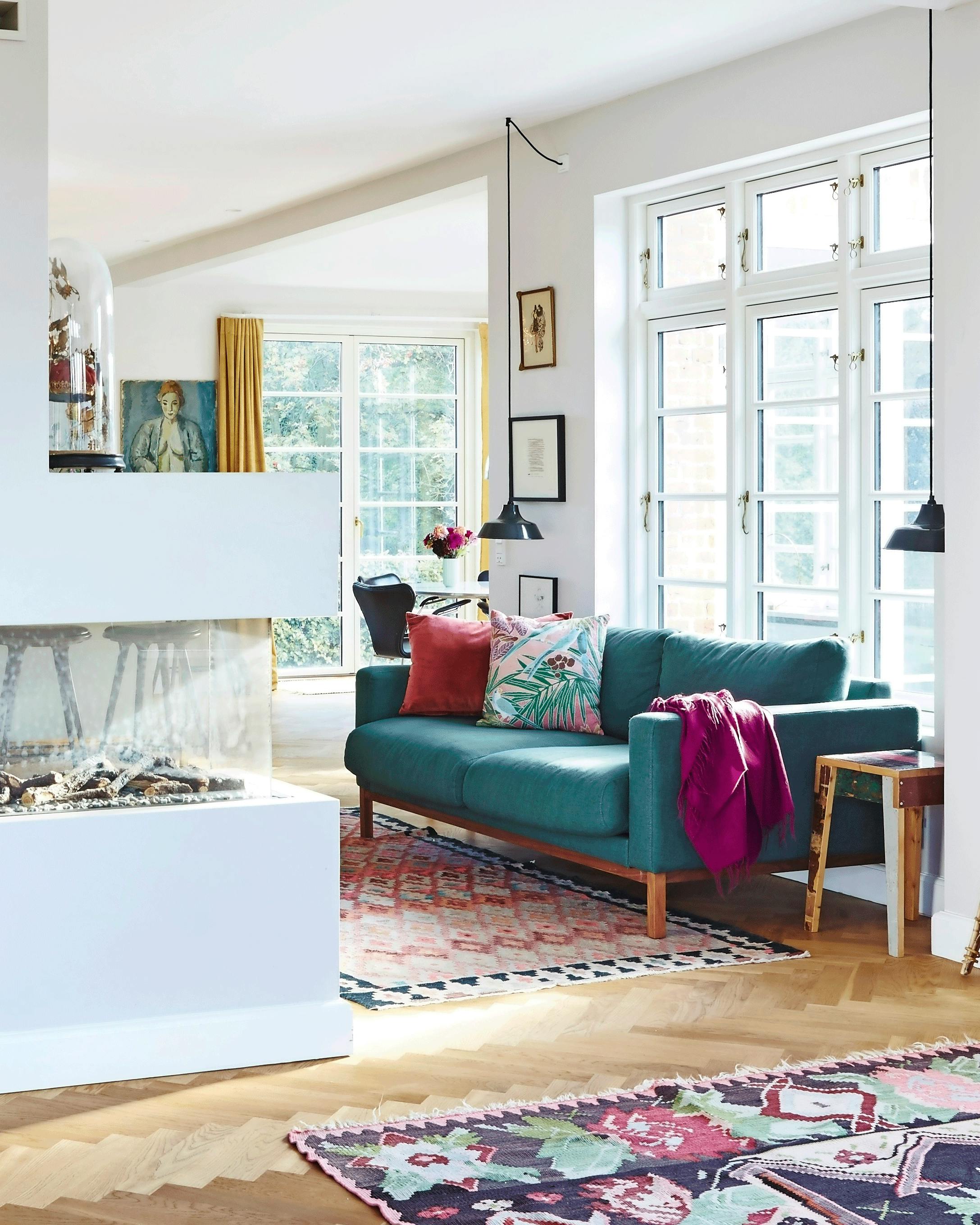 – Alle lyse vægge skal males, men vi skulle lige bo i huset lidt tid, før jeg kunne fornemme, hvilke farver der skulle i spil. Samtidig skal de nye farver passe til vores gulvtæpper, som er en essentiel del af indretningen. Vi har boet i London, og med derfra har vi taget 'comfy-floors', som er væg til væg-tæpper. Vi danskere er nok en smule forskrækkede over dem, men de giver hygge og er super lyddæmpende, forklarer Fie Aspöck Jonsen, der alligevel har ladet trægulvet blive fremme i størstedelen af hjemmet.